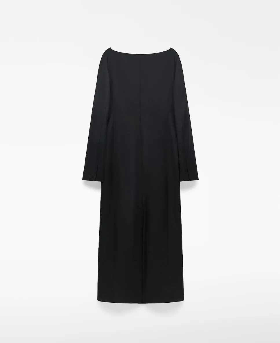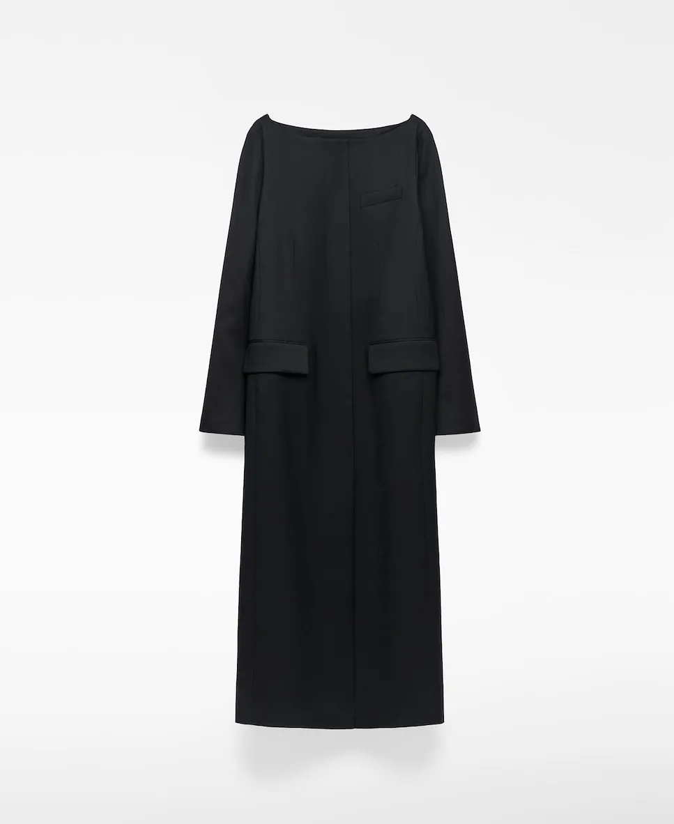 Платье кроя 'савр' с вырезом лодочкой. Имеет длинный японский рукав, нагрудный карман с кантом, карманы с клапанами спереди и центральный разрез на спинке. Длина миди.