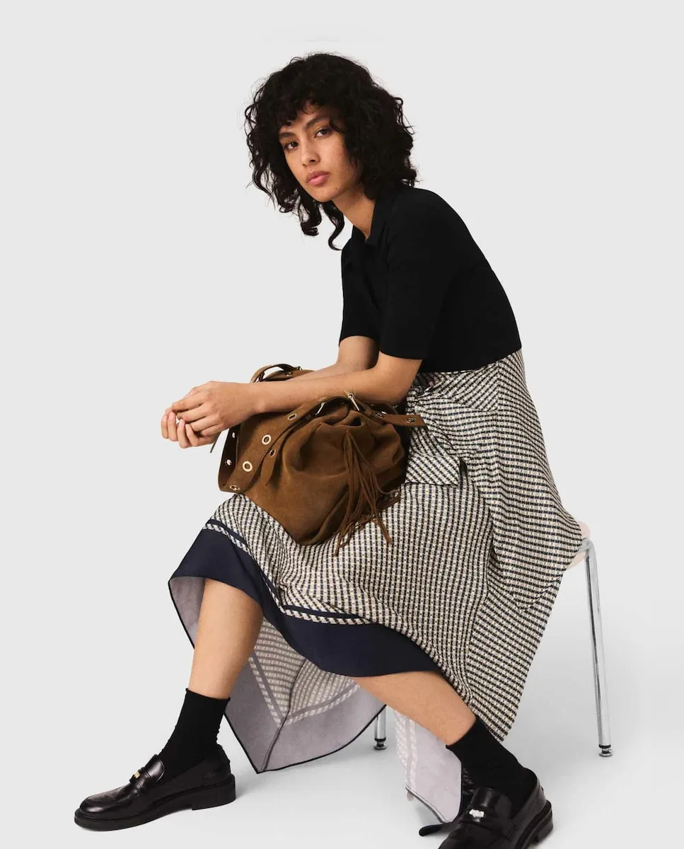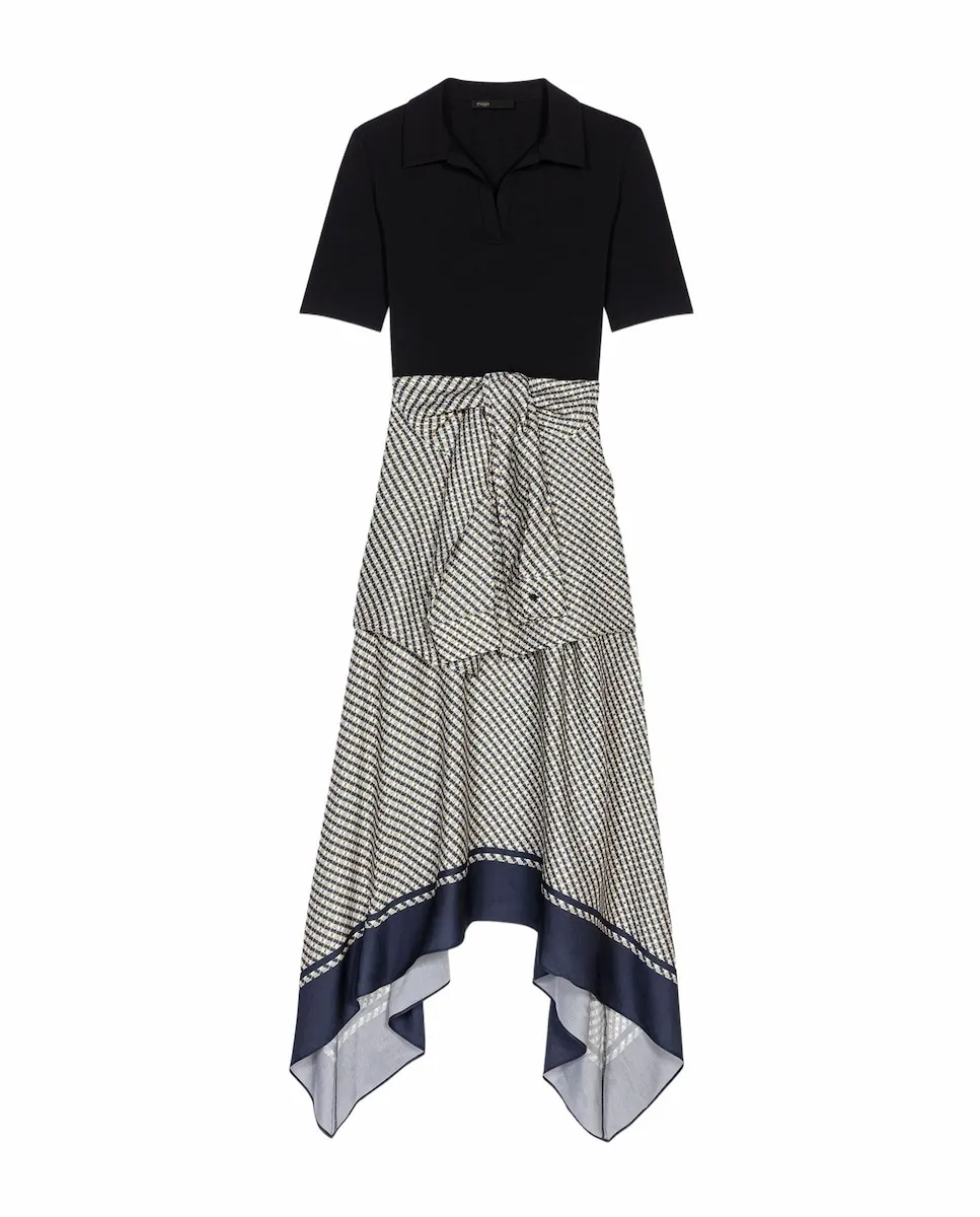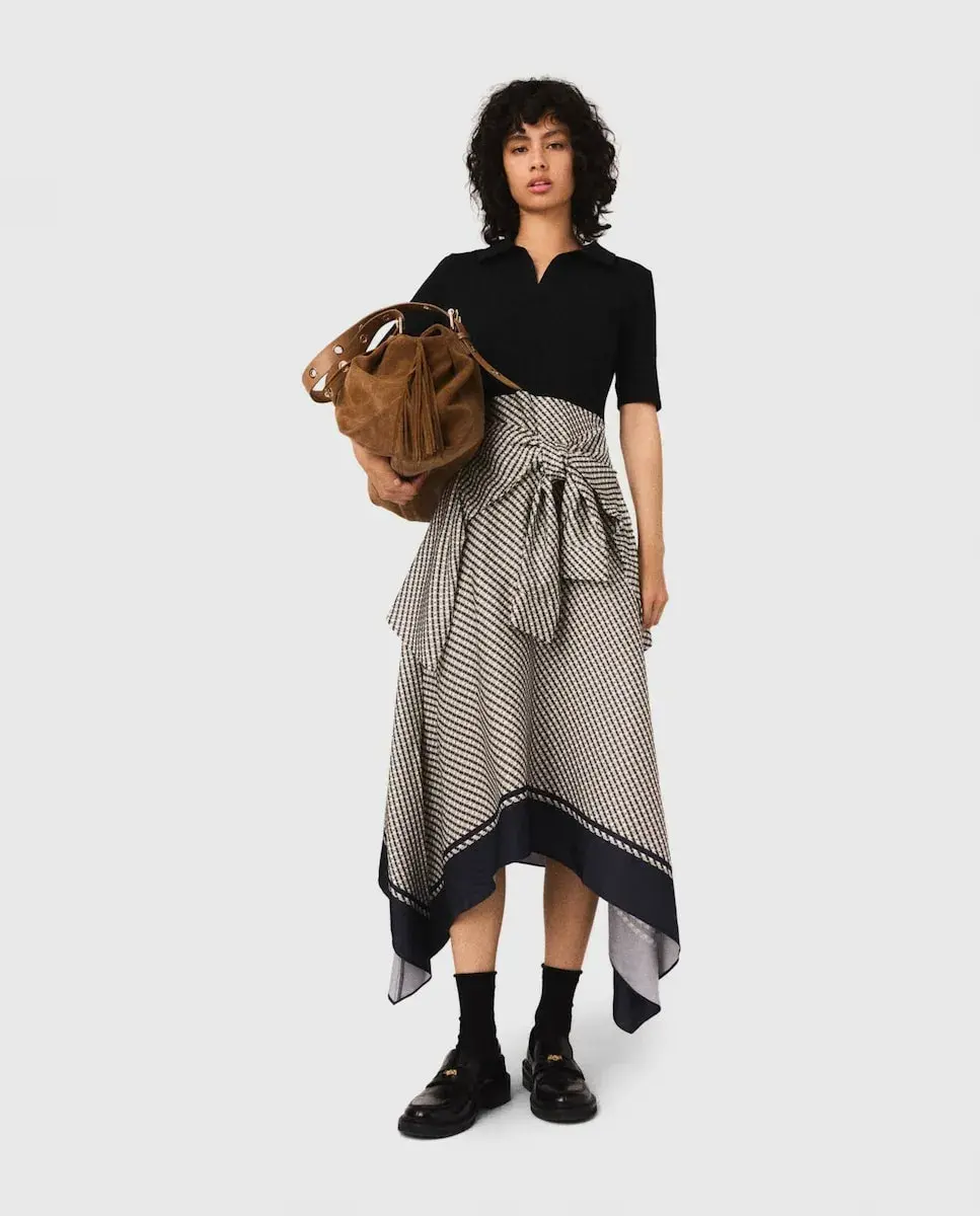 Миди-платье из двух материалов. Футболка с короткими рукавами и застежкой-поло на пуговицах. Атласная юбка с асимметричным принтом с бантом по бокам. Коллекция играет на контрастах с гибридными вещами с неожиданными объемами и яркими принтами. Это платье из двух материалов объединяет структурированный топ-поло и атласную юбку с принтом в виде банта, удлиненную панелью с длинными рукавами для завязывания спереди. Оригинальная конструктивная деталь, создающая образ с характером. Сочетается с эффектными аксессуарами, такими как объемная сумка и кожаные мокасины.