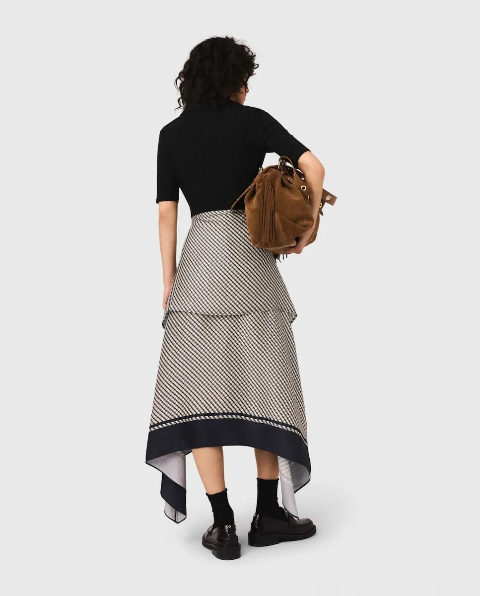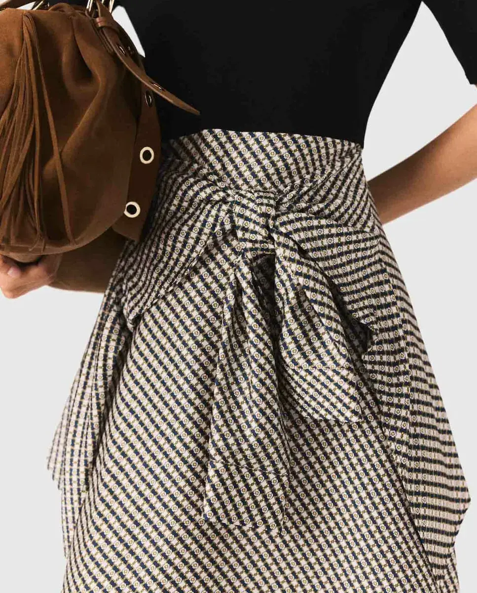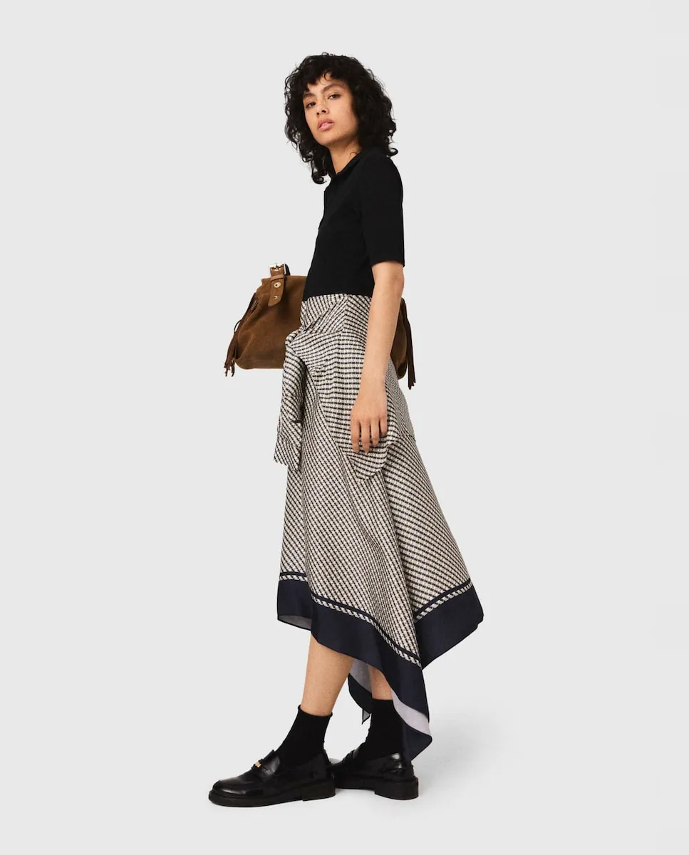 Миди-платье из двух материалов. Футболка с короткими рукавами и застежкой-поло на пуговицах. Атласная юбка с асимметричным принтом с бантом по бокам. Коллекция играет на контрастах с гибридными вещами с неожиданными объемами и яркими принтами. Это платье из двух материалов объединяет структурированный топ-поло и атласную юбку с принтом в виде банта, удлиненную панелью с длинными рукавами для завязывания спереди. Оригинальная конструктивная деталь, создающая образ с характером. Сочетается с эффектными аксессуарами, такими как объемная сумка и кожаные мокасины.