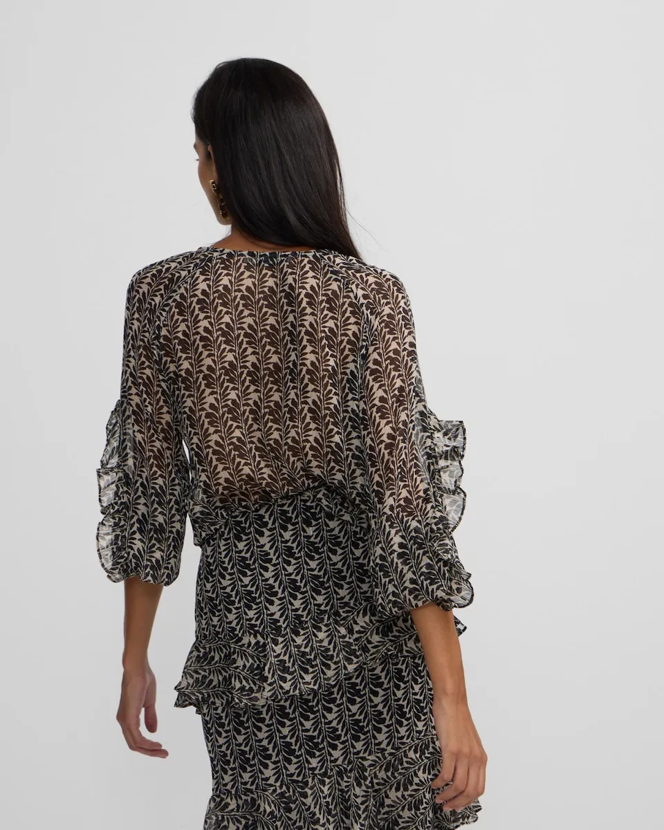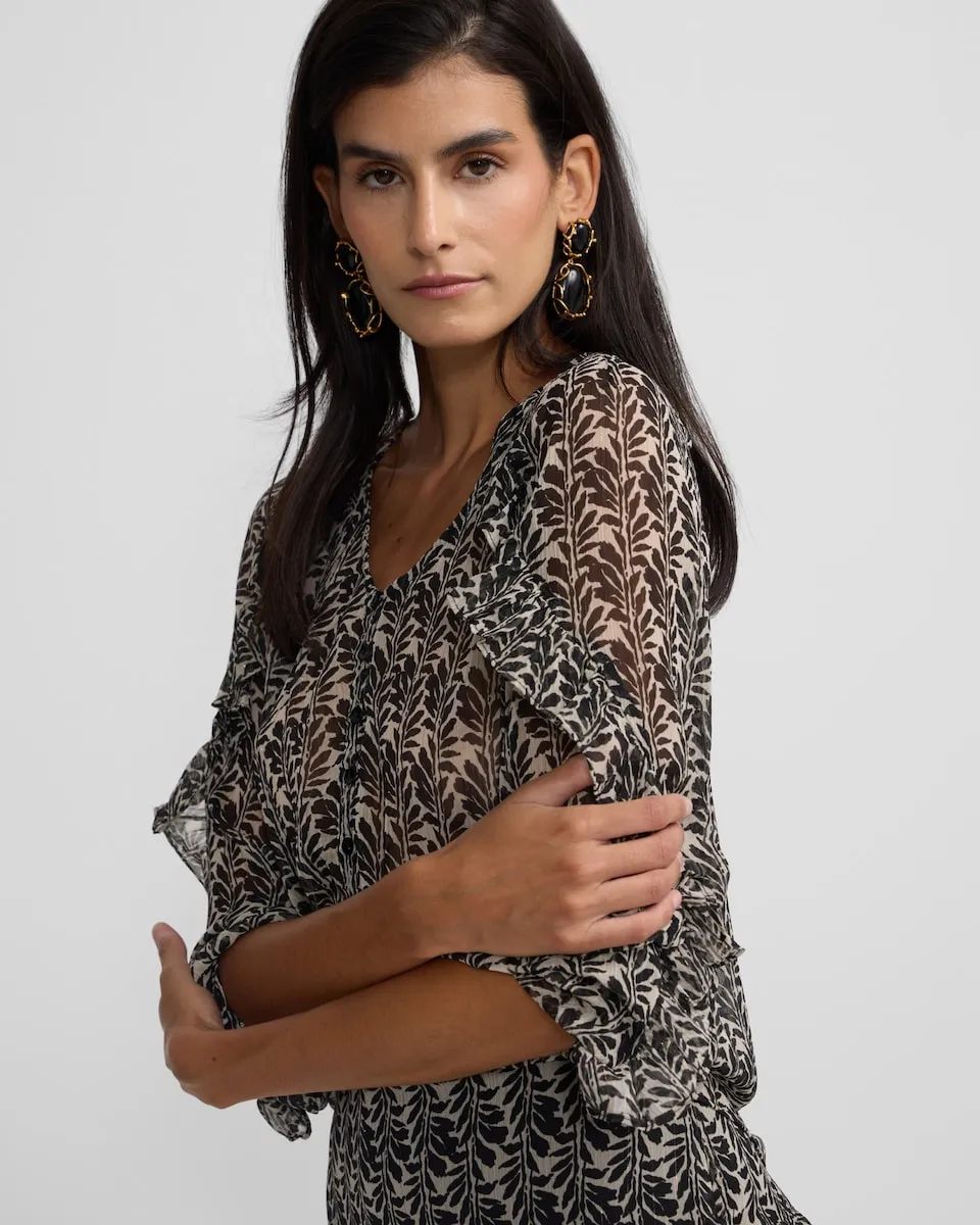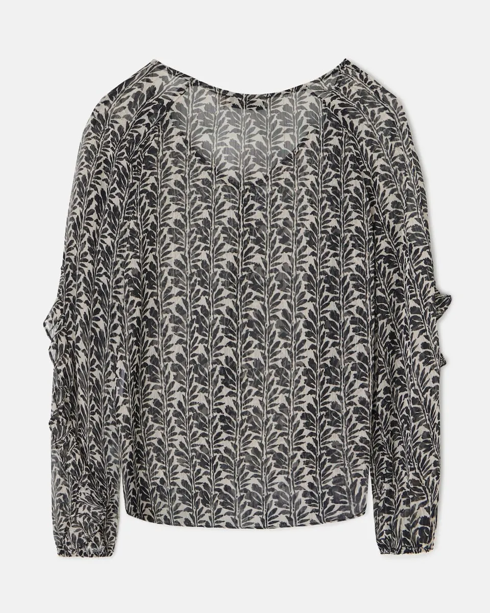 Свободная блузка с принтом в бело-черных тонах. Имеет V-образный вырез, рукава с объемным эффектом с эластичными манжетами и рюшей на плечах и рукавах. Застегивается на пуговицы спереди у выреза. Сшита в Испании.