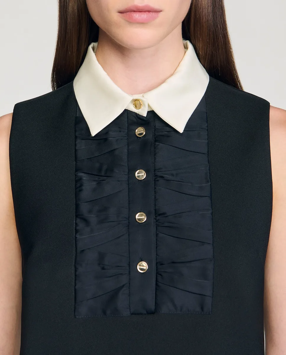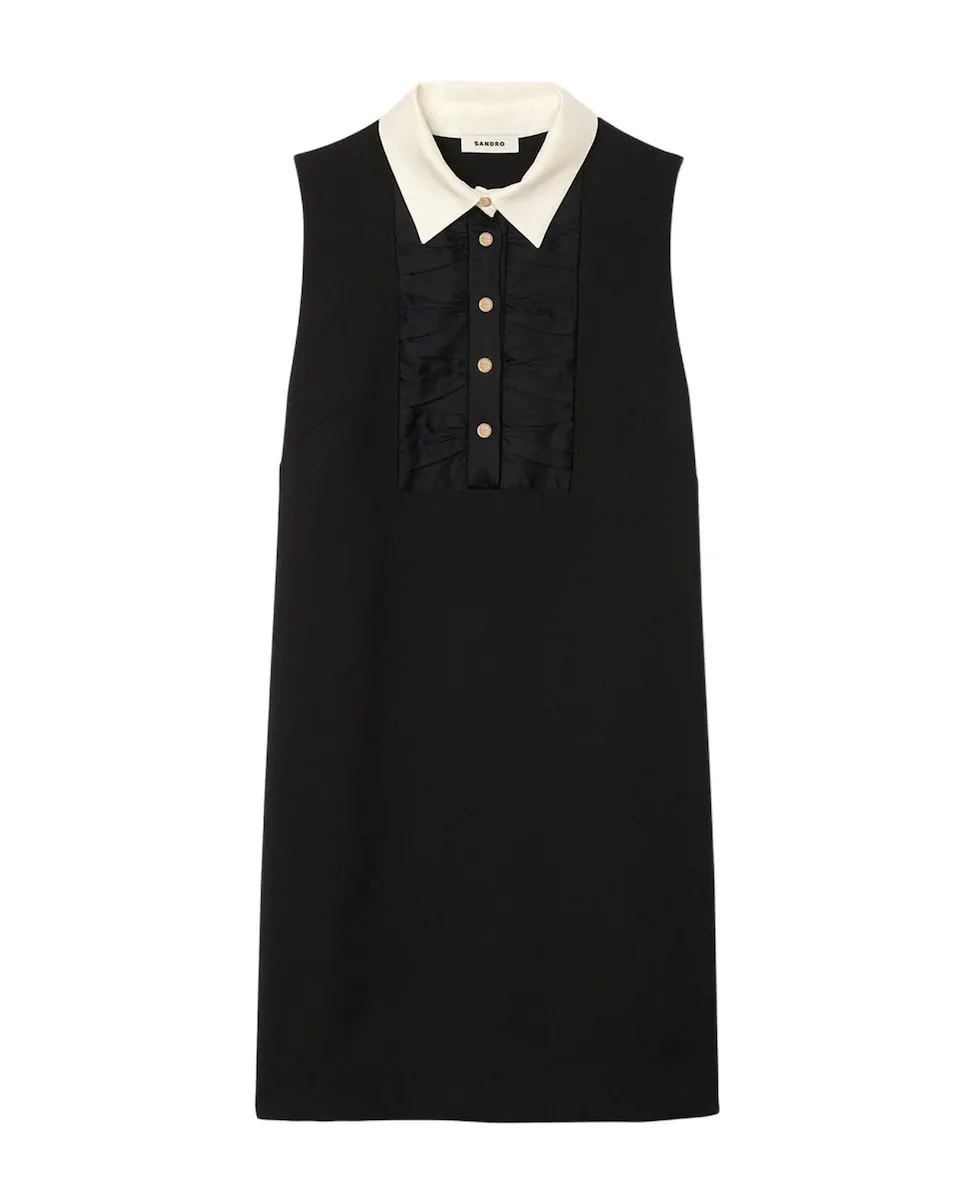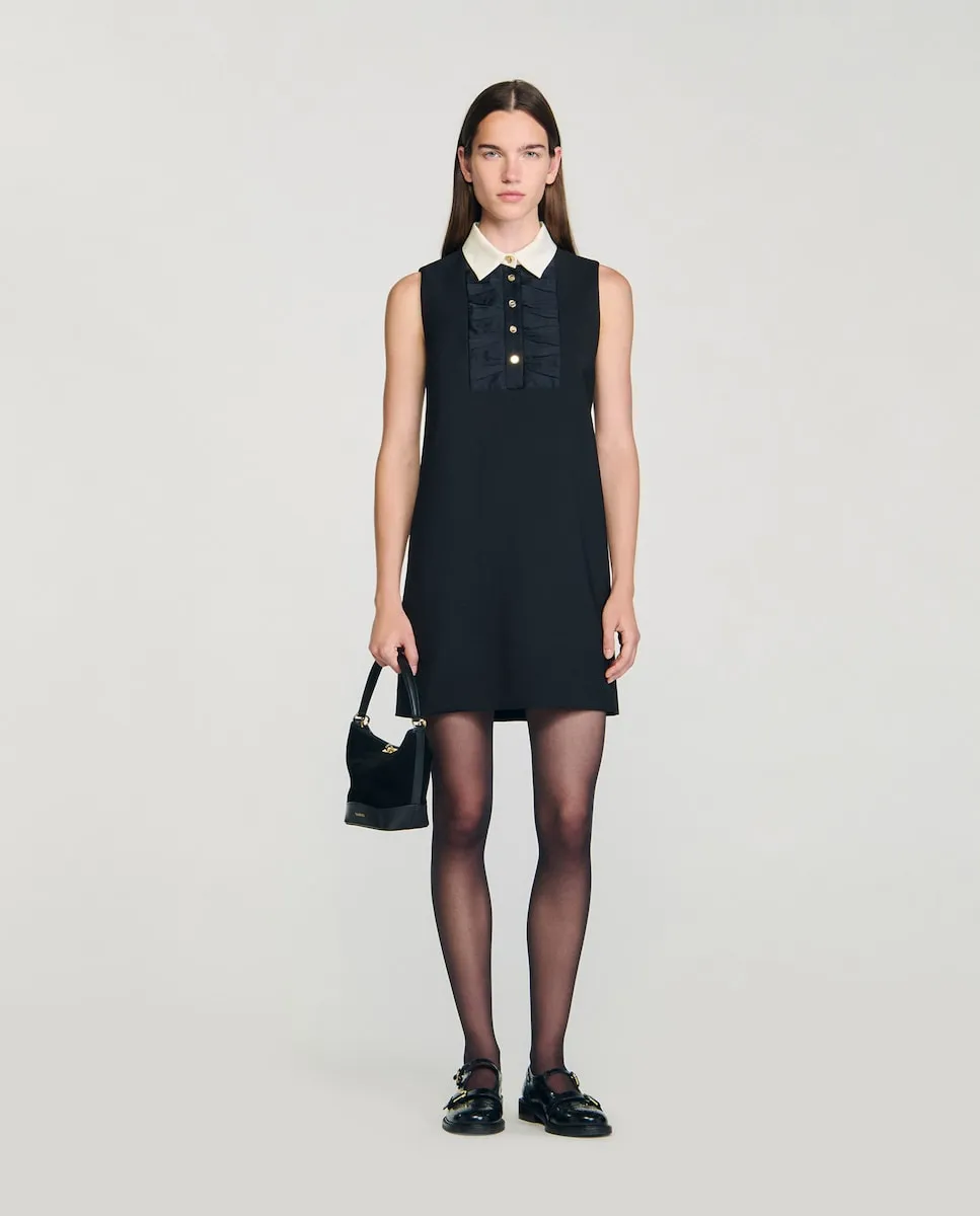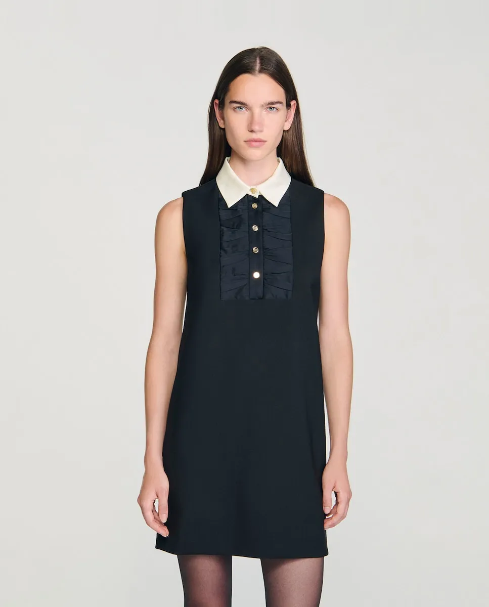 Короткое платье без рукавов с воротником-рубашкой контрастного цвета и нагрудной частью с бантом, с застежкой на планку с пуговицами спереди. Короткое платье Sandro для женщин. Контрастный воротник-рубашка. Нагрудная часть с эффектом банта. Застежка на планку с пуговицами спереди.