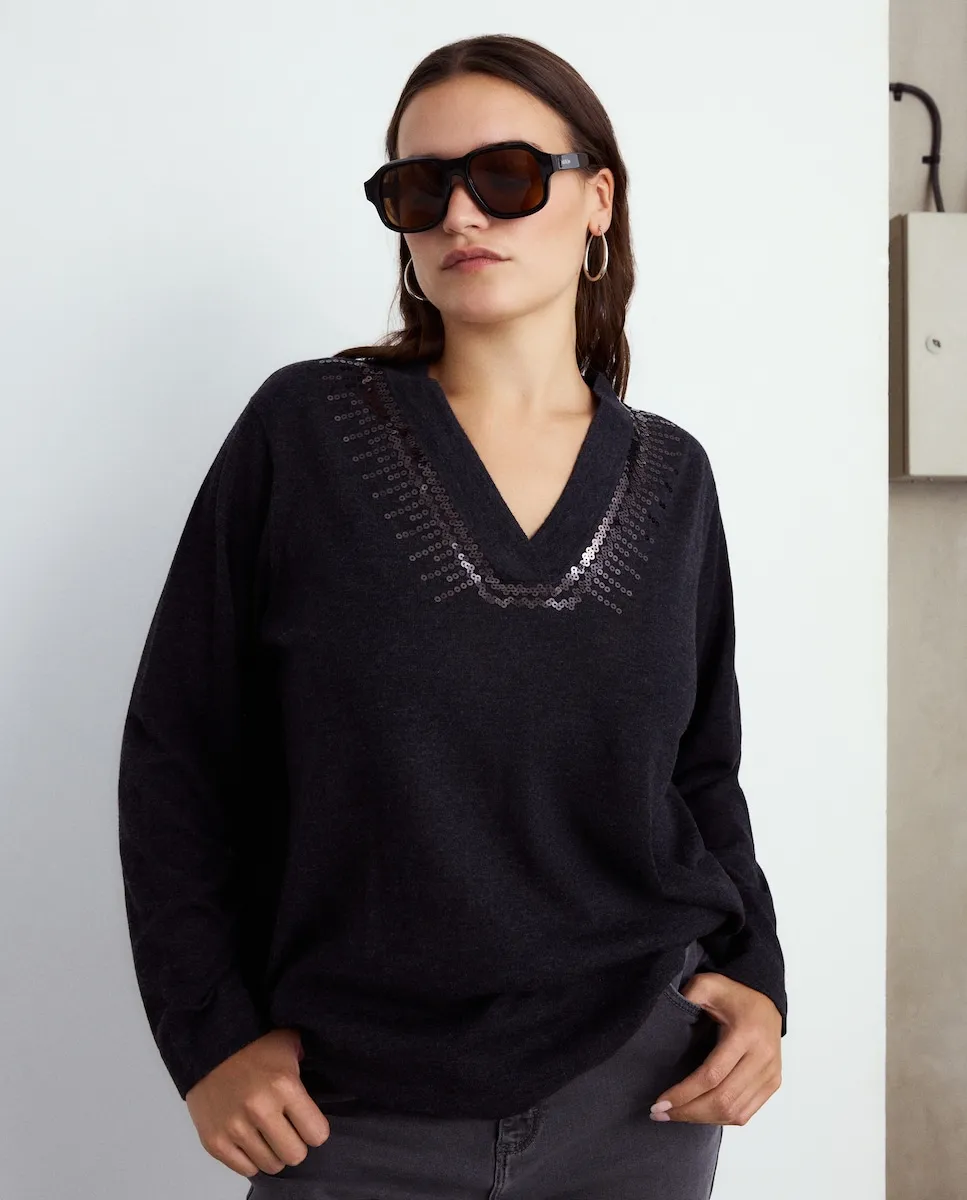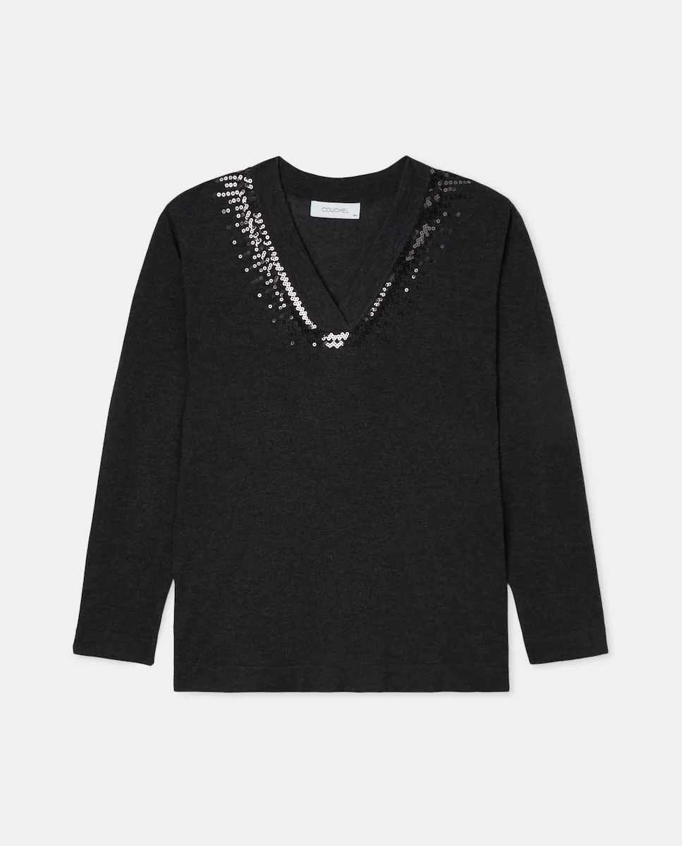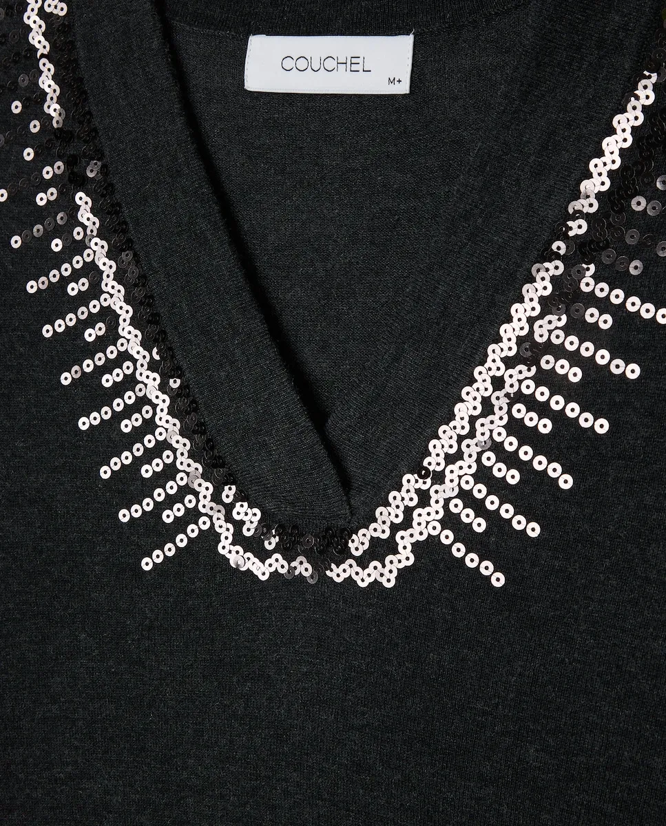 Однотонный джемпер с V-образным вырезом и деталями из пайеток на воротнике.