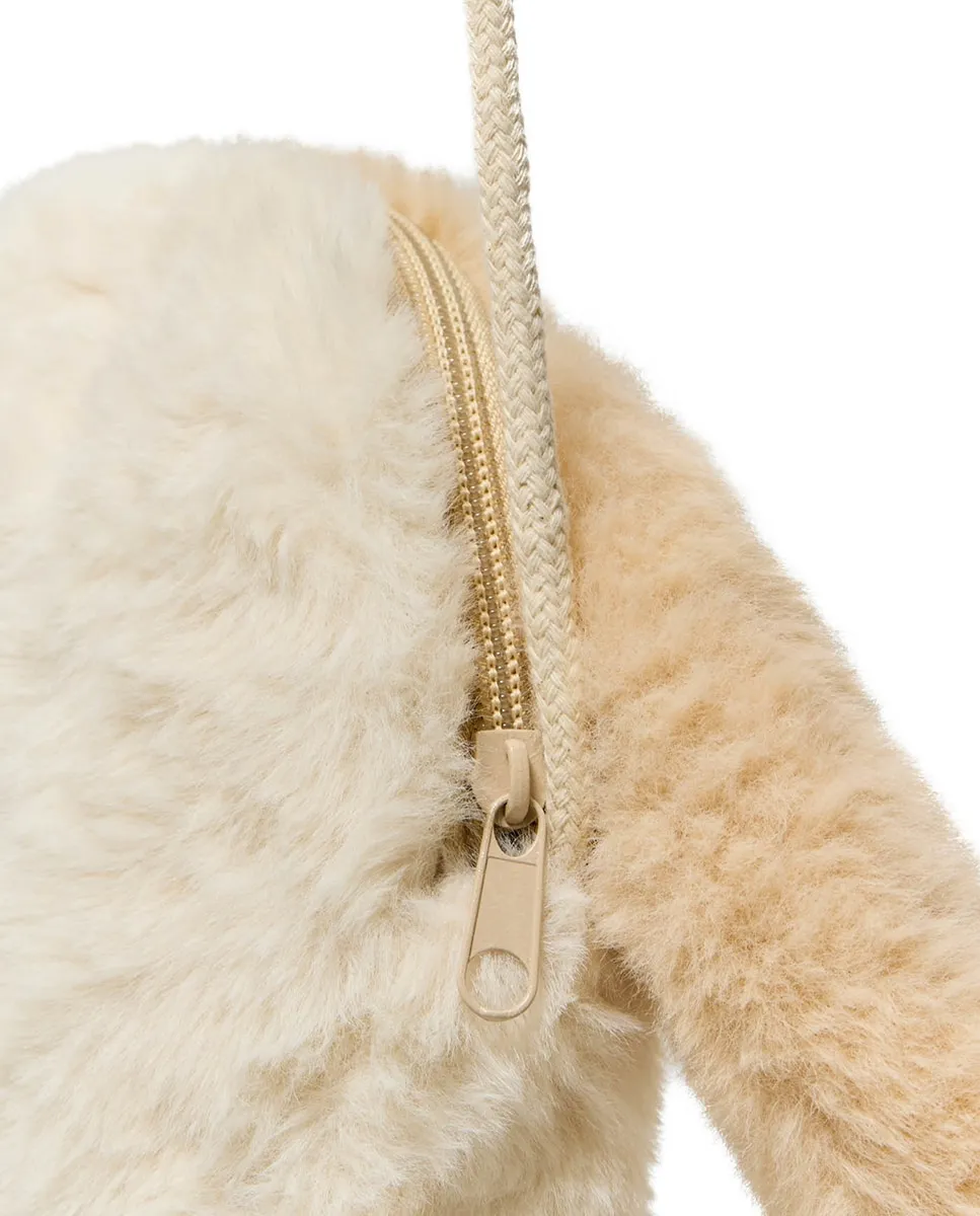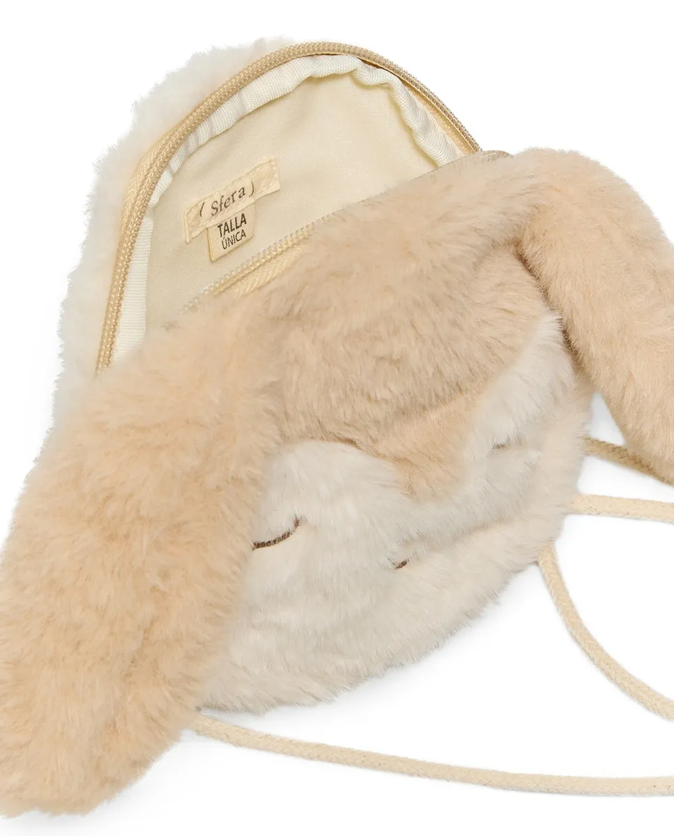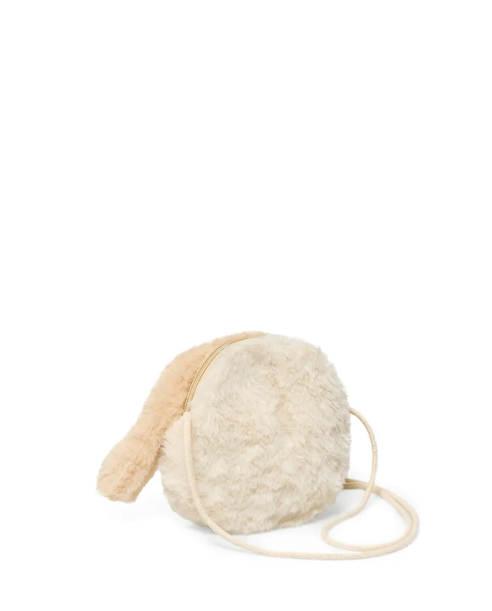 Круглая сумка с эффектом меха и деталями в виде ушек. Верхняя молния и ремешок через плечо на шнурке.
