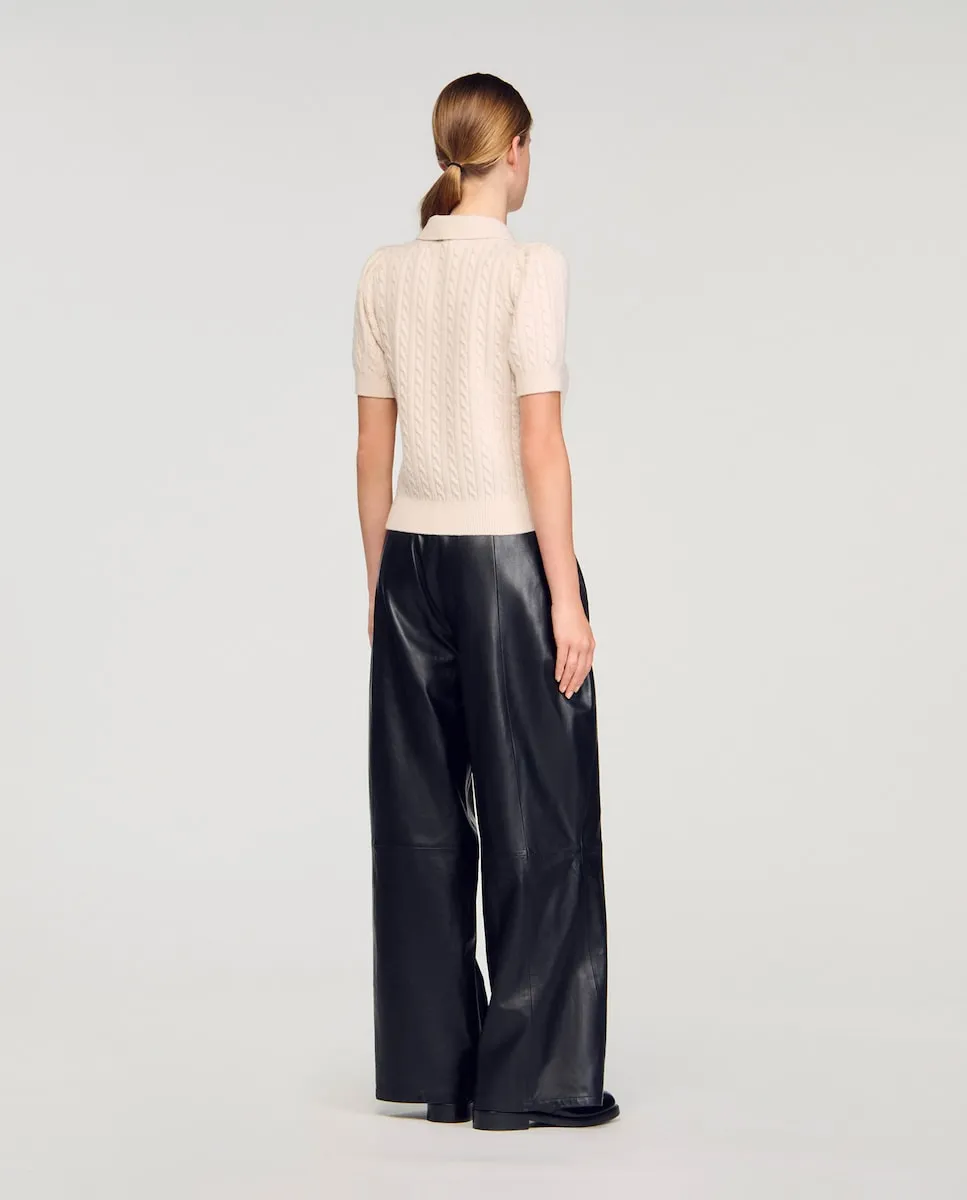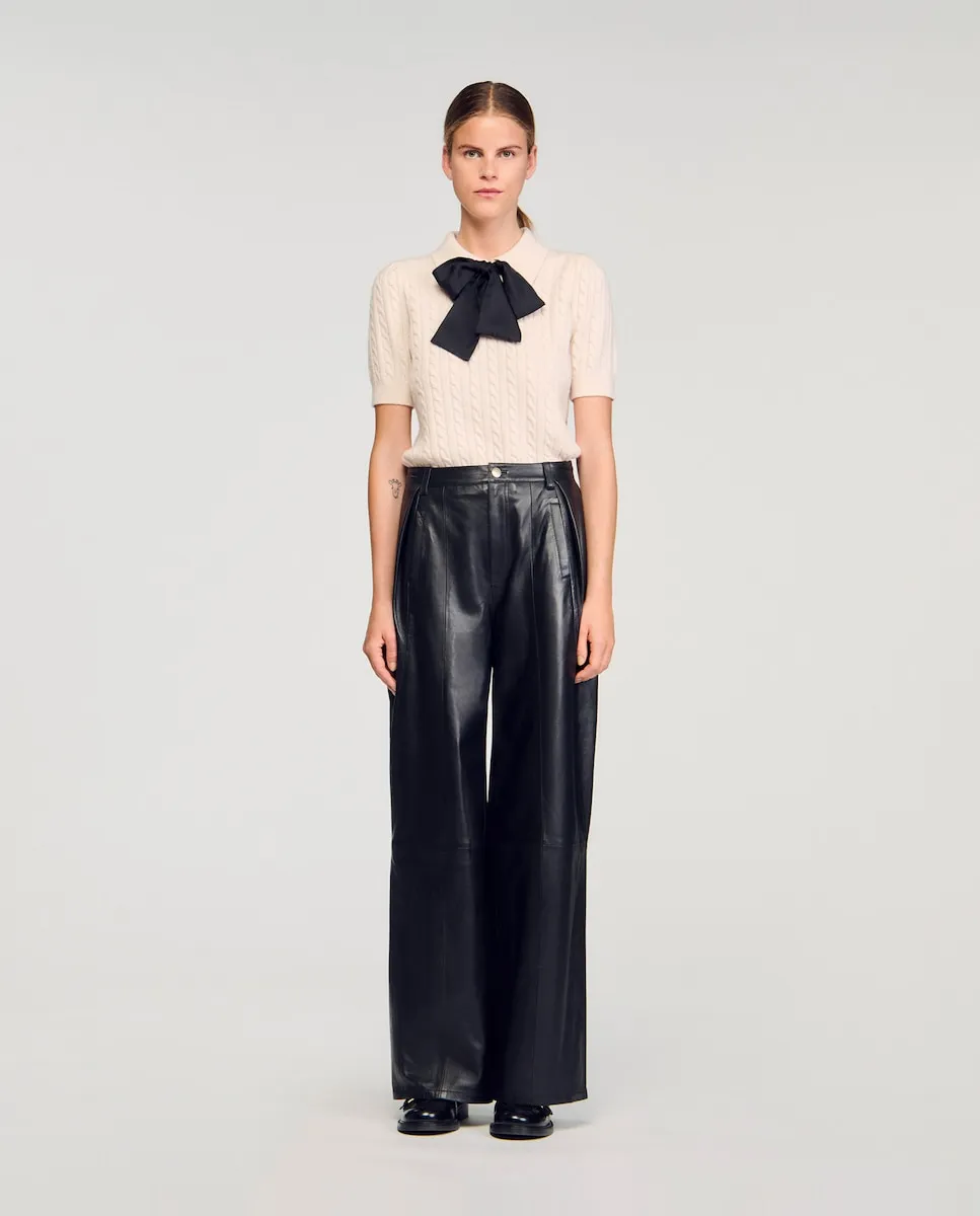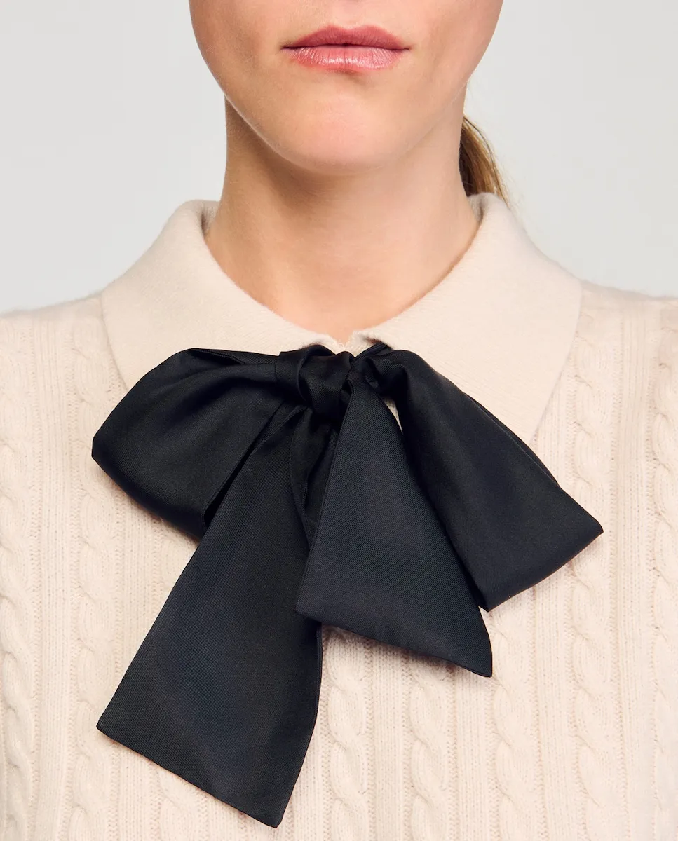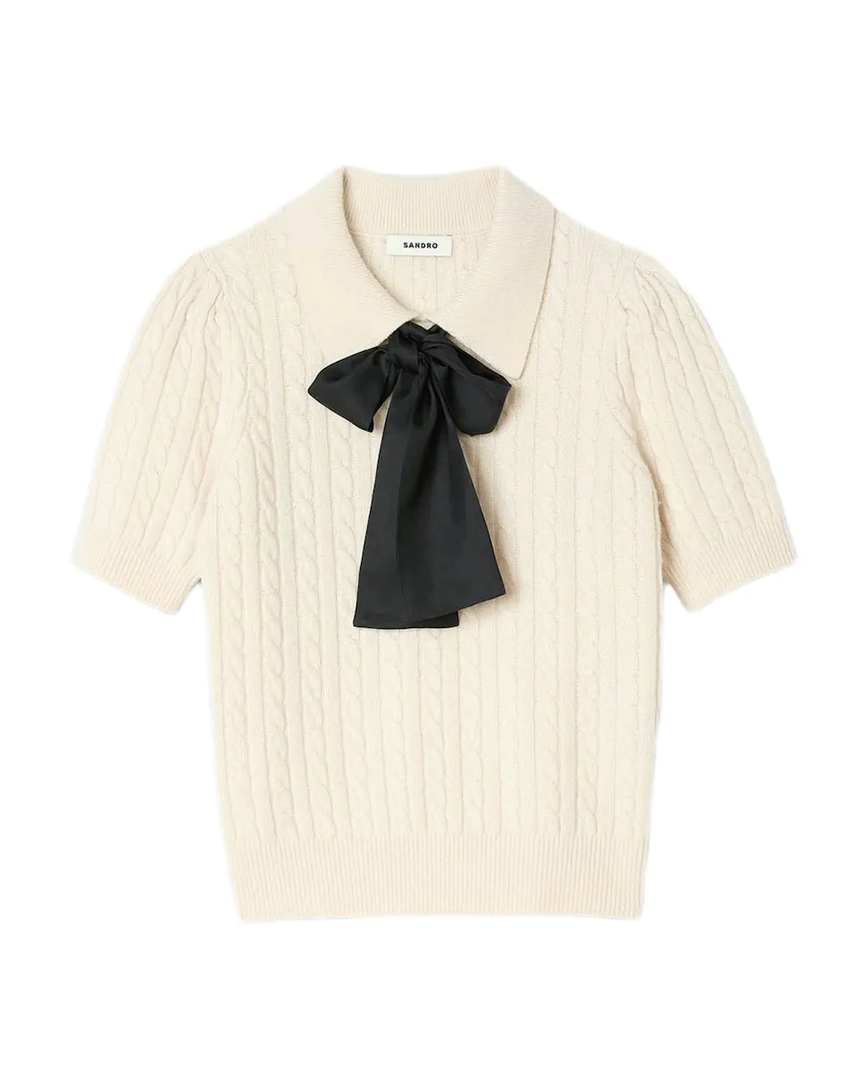 Тонкий трикотажный джемпер с воротником поло и контрастным галстуком, с короткими рукавами и ребристыми отделками. Тонкий трикотажный джемпер Sandro для женщин. Прямой крой. Воротник поло. Короткий рукав. Контрастный галстук. Ребристые отделки.