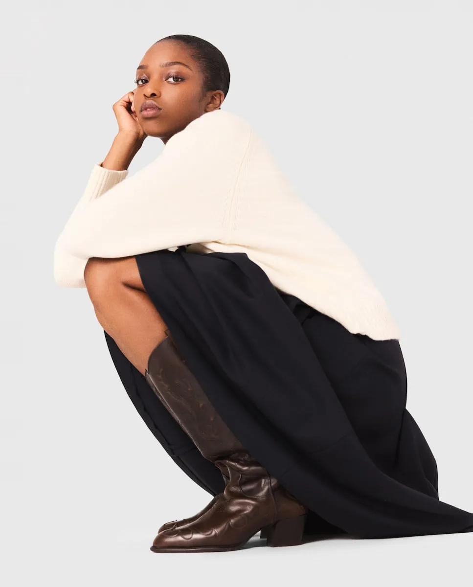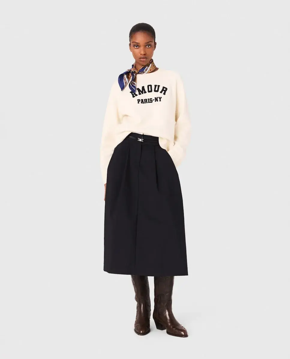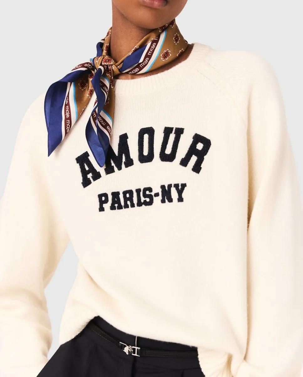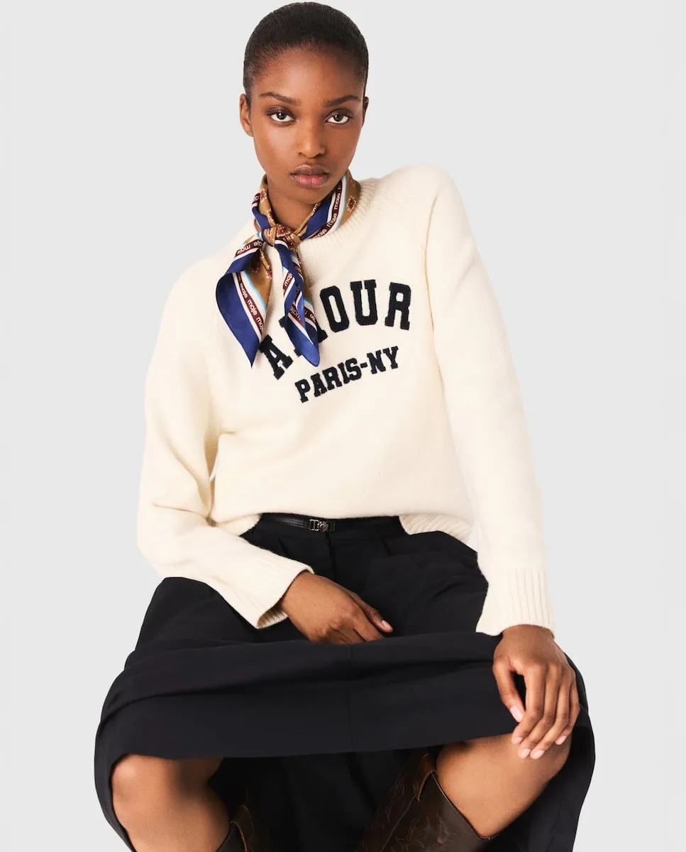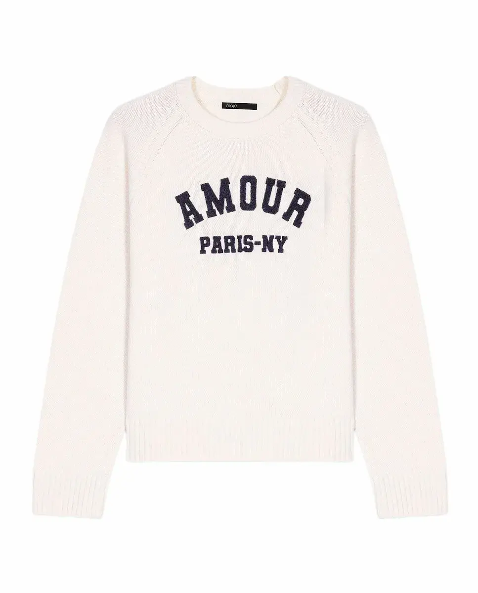 Джемпер с длинными рукавами из ребристого трикотажа. Надпись Amour Paris-NY. Ребристая отделка по краям. Вдохновленный энергией Нью-Йорка и парижской элегантностью, этот джемпер делает ставку на комфорт, не отказываясь от стиля. Выполненный из ребристого трикотажа, он отличается вышитой надписью Amour Paris NY и удобным фасоном для повседневной носки. Сочетайте его с длинными брюками в деловом стиле с ремнем, платком, завязанным на шее, и ковбойскими сапогами для создания повседневного шикарного образа, идеально подходящего как для города, так и на выходные.