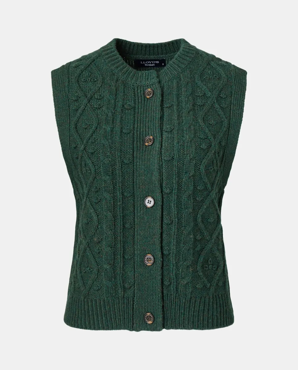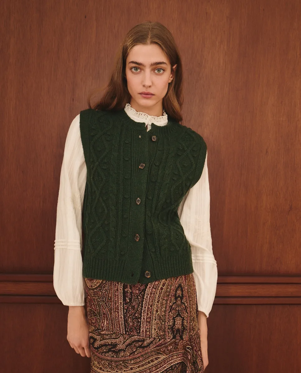 Однородный вязаный жилет на пуговицах с декоративными элементами.