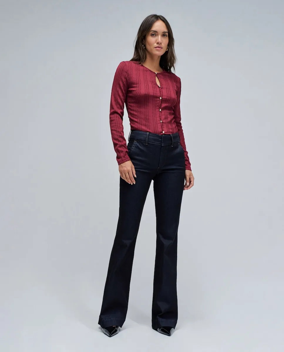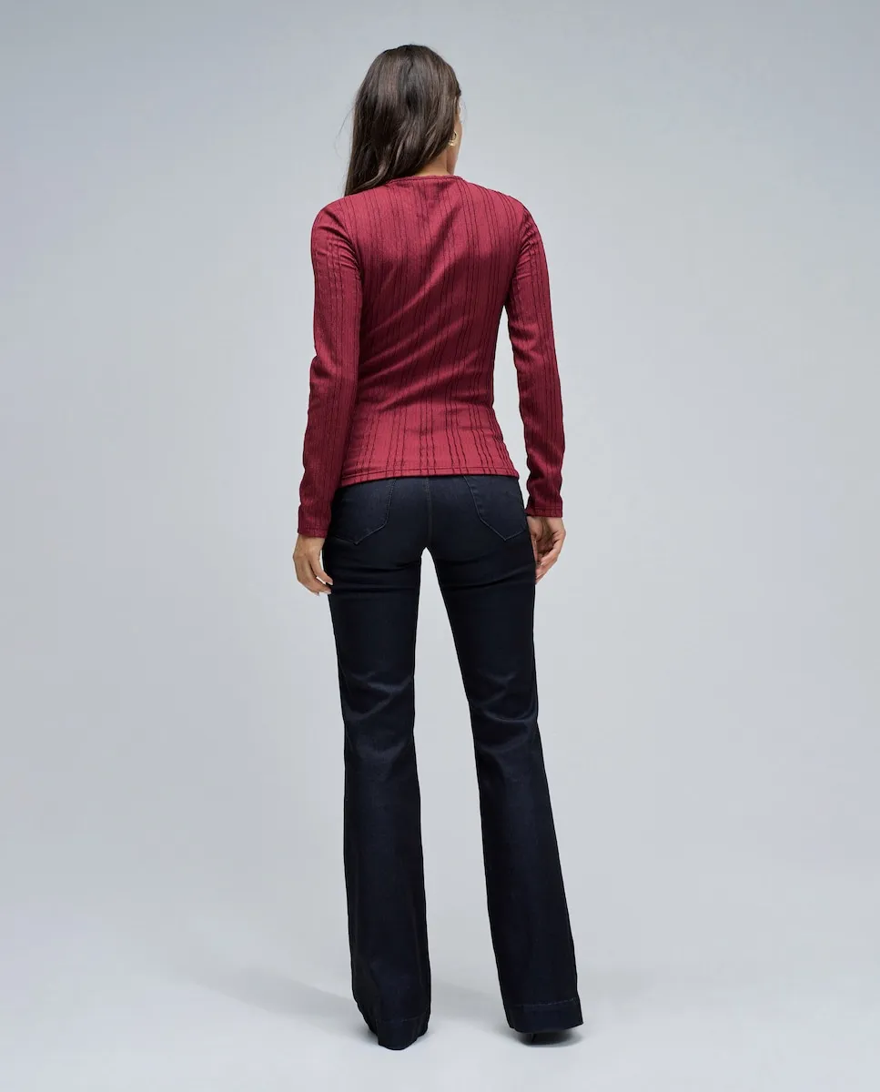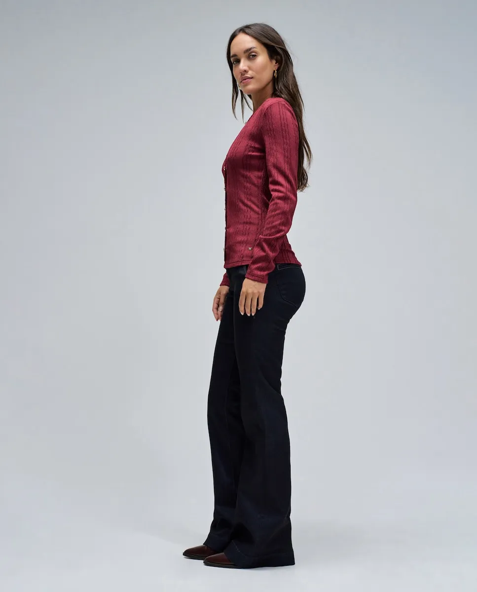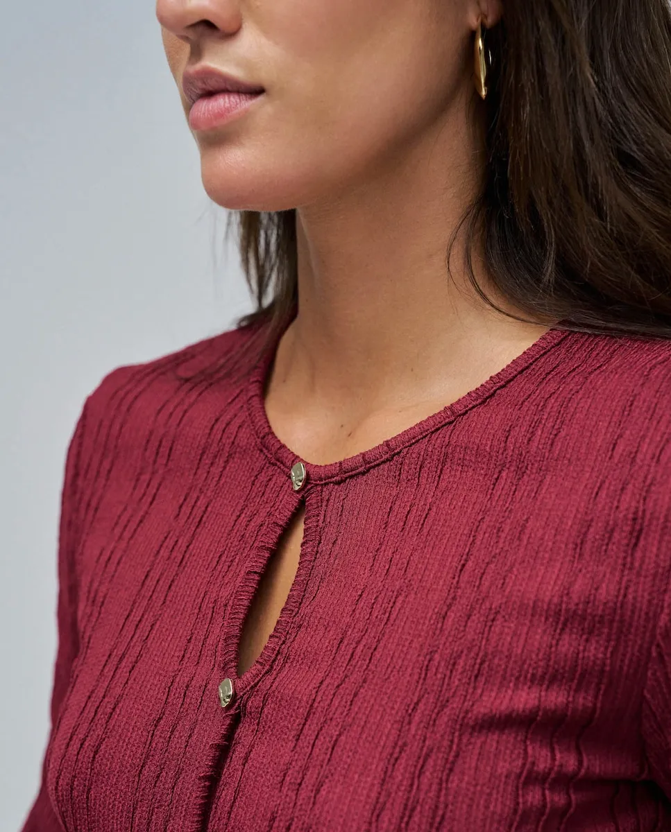 Вещь, сочетающая в себе изысканность и современность. Этот текстурированный джемпер с приталенным кроем элегантно подчеркивает силуэт. Круглый вырез с легким разрезом на груди добавляет женственности и нежности, а золотые пуговицы делают деталь главным акцентом. Универсальная и утонченная, это идеальный выбор для повседневных образов с ноткой изысканности. Текстурированный джемпер. Приталенный крой. Длинные рукава. Круглый вырез. Разрез на груди. Деталь с золотыми пуговицами. Для справки: модель имеет рост 1,74 м и носит размер S.
