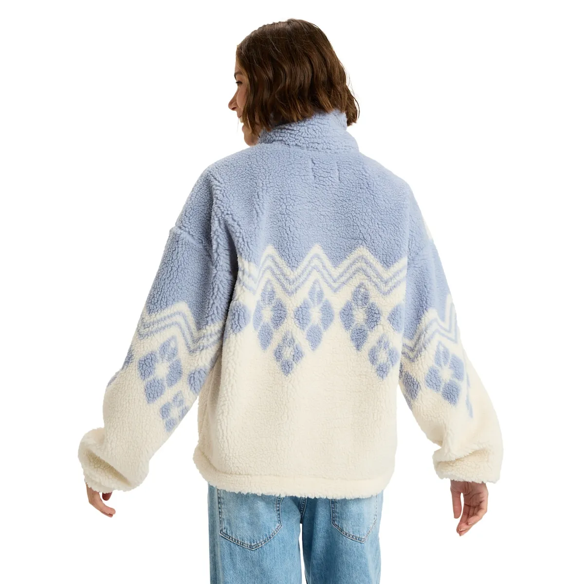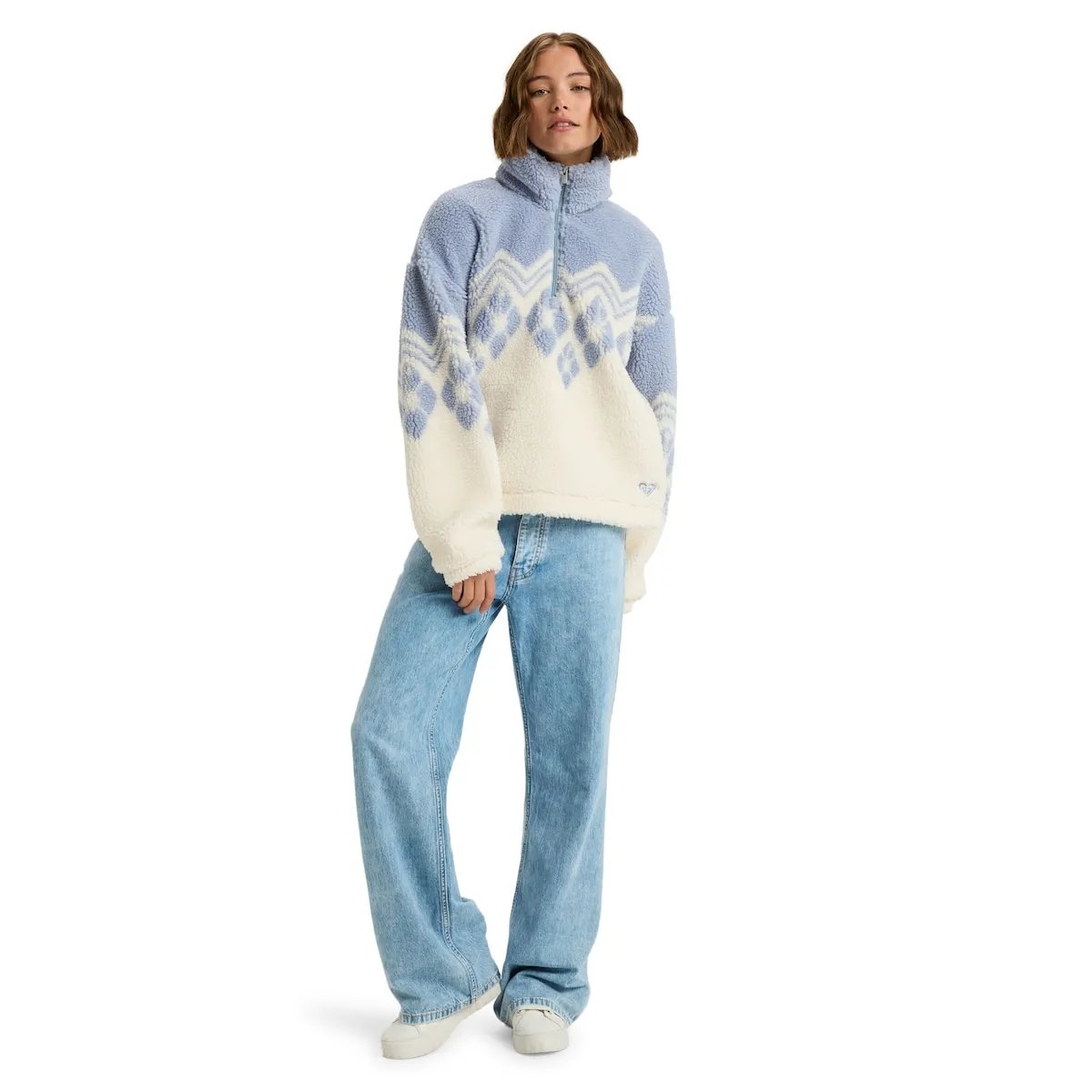 Флисовая кофта с застежкой-молнией до половины для женщин. Характеристики включают: Ткань: шерпа с принтом из переработанного полиэстера, Крой: стандартный, Воротник: высокий воротник, Застежка: металлическая молния с бегунком Roxy, Дополнительно: нашивка Roxy из кожи на левом рукаве.