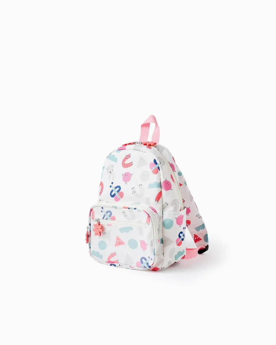 Белый рюкзак для малышей и девочек с разнообразными узорами и цветами. Основное отделение и наружные карманы на застежке-молнии. Резиновые ручки в виде цветка. Открытые боковые отделения, идеально подходят для бутылочек, игрушек или других предметов. Спинка с мягкой подкладкой и регулируемые ремни. Аксессуар, который был так нужен для повседневной жизни вашего малыша! Размеры: 31x24x10 см.