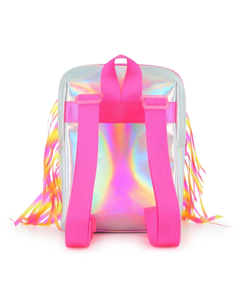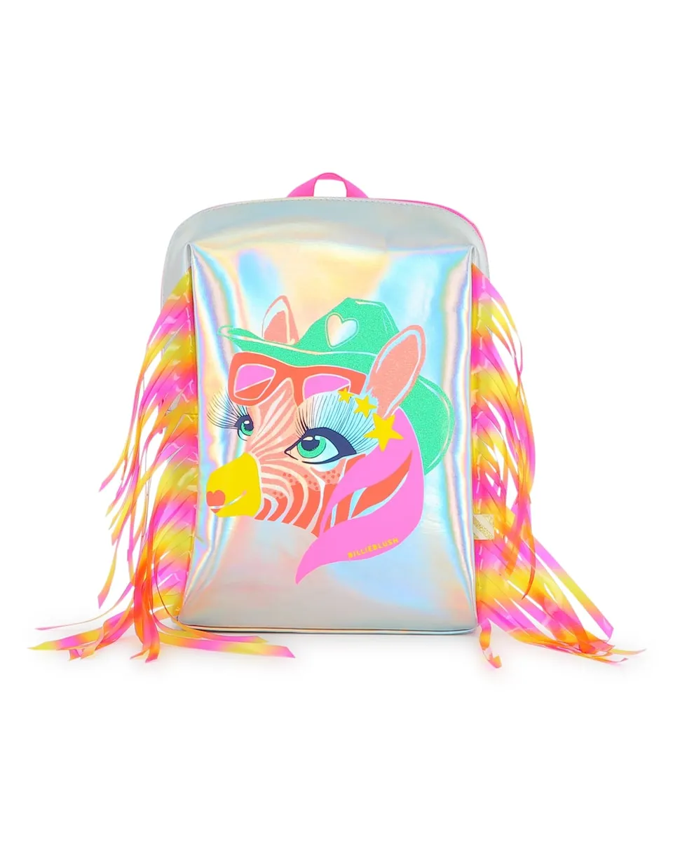 Этот рюкзак BILLIEBLUSH с его блестящей покрытой тканью с отблесками и бахромой из градиентного поливинилхлоридного материала выделяется своим уникальным стилем. Неоновые "вестерн" иллюстрации и пайетки создают смелый образ, а регулируемые ремни обеспечивают плотную посадку.