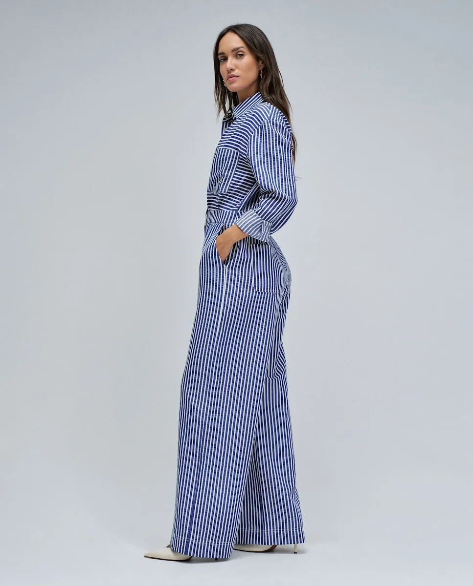 Этот синий и белый полосатый комбинезон является идеальным выбором для современного и непринужденного образа. С широкой штаниной он сочетает в себе комфорт и элегантность в универсальном дизайне. Нижняя часть оснащена застежкой-молнией и крючками, а верхняя часть закрывается классическими пуговицами. Детали, такие как нагрудный карман, задний карман и два кармана в стиле чинос, обеспечивают функциональность, не жертвуя стилем. Манжеты на пуговицах и вырез горловины придают аккуратный и структурированный вид. Полосатый комбинезон. Цвет синий и белый. Широкие штанины. Нижняя часть с молнией и крючками, верхняя часть с пуговицами. Нагрудный и задний карманы. Два кармана в стиле чинос. Манжеты на пуговицах. Вырез горловины. Для справки: модель имеет рост 1,74 м и носит размер S.