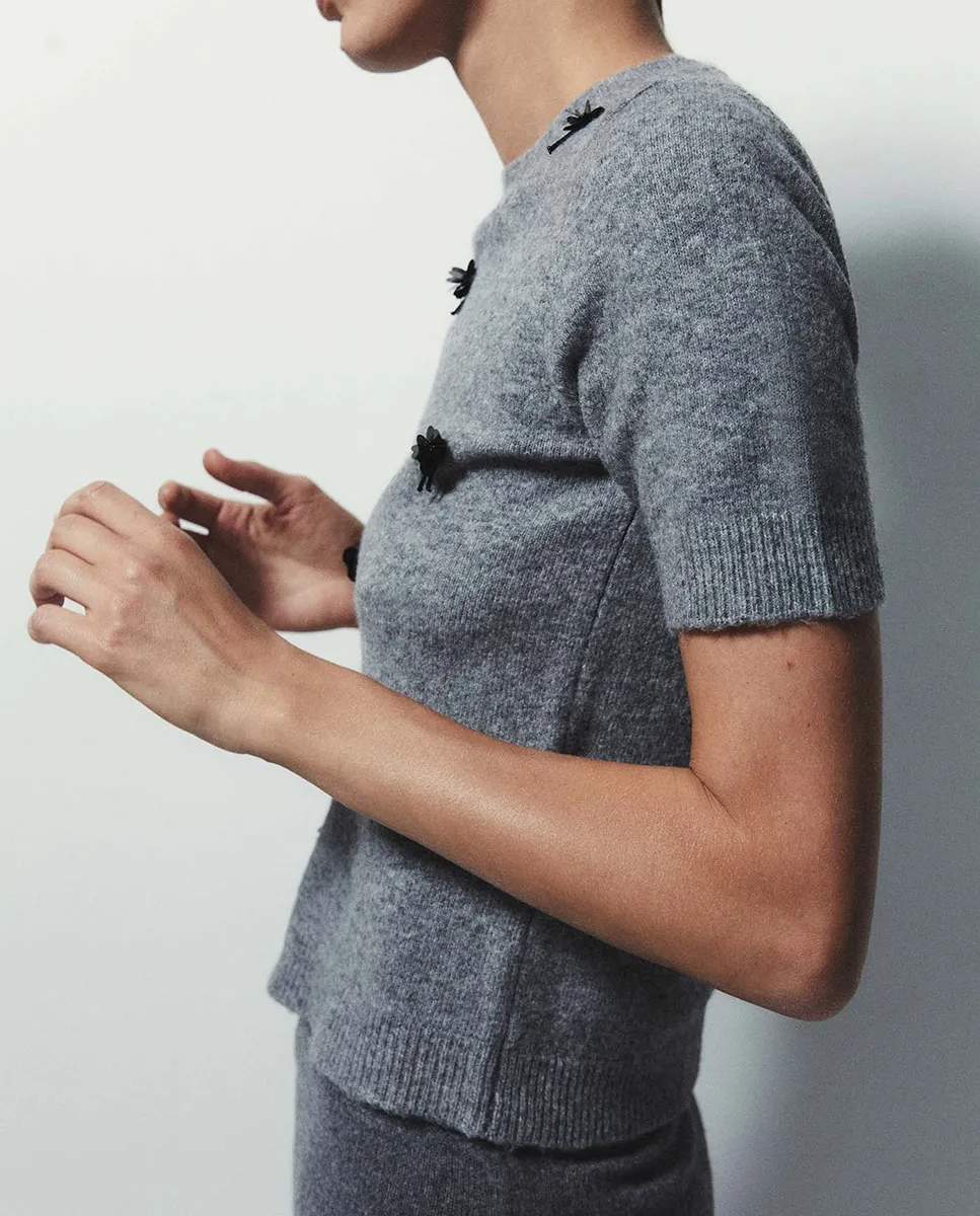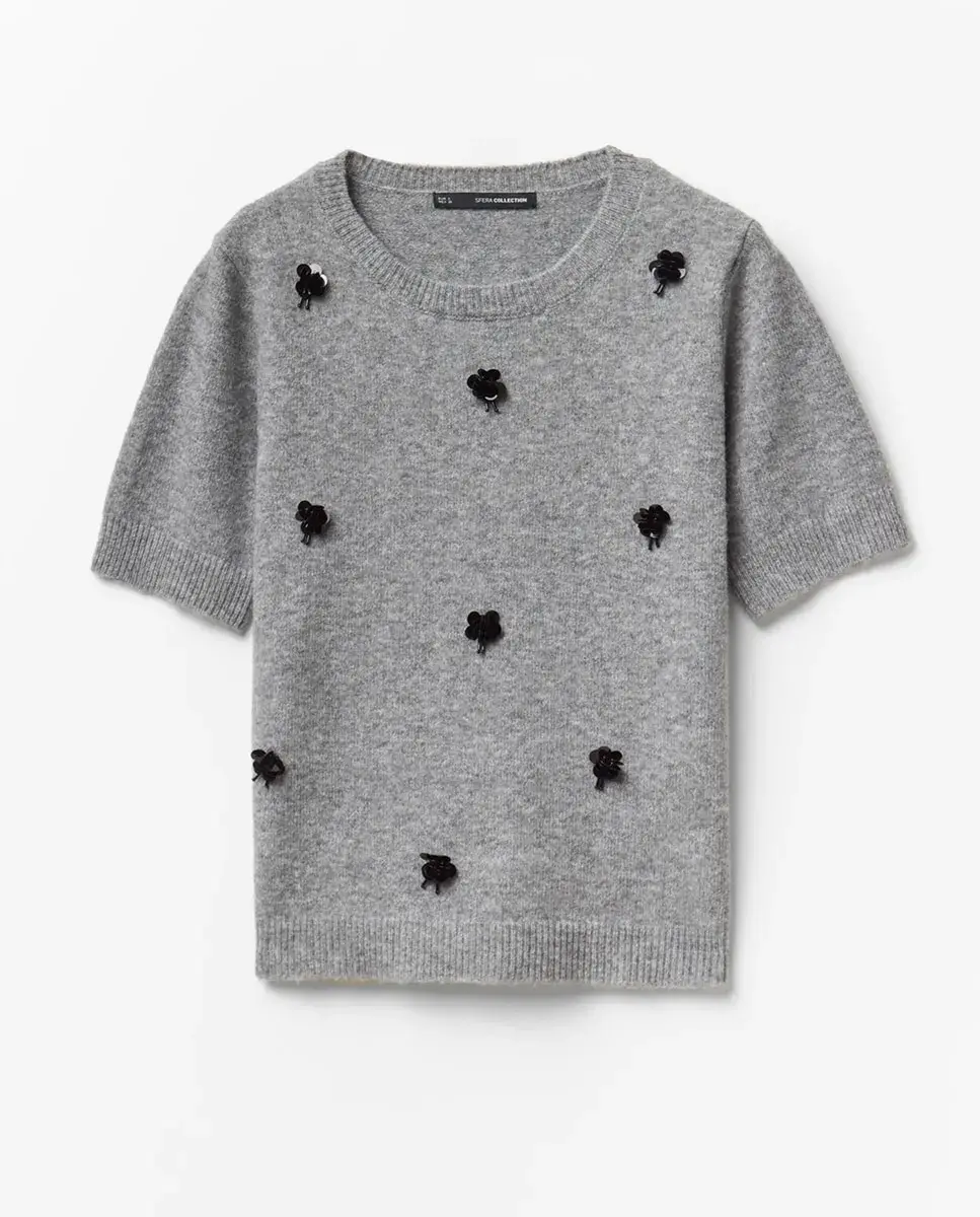Футболка с коротким рукавом и круглым вырезом с цветочными аппликациями из бисера