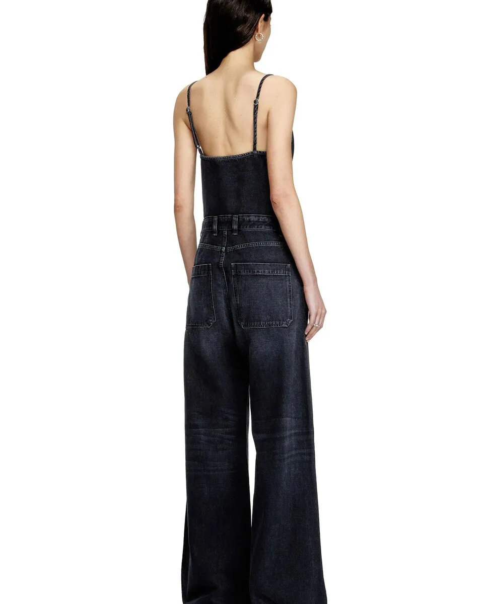 Этот женский джинсовый комбинезон имеет обтягивающий топ с бретельками и свободный крой штанин. Нижняя часть оснащена карманами, вдохновленными рабочей одеждой, а на груди украшение в виде металлической пластины с логотипом D.