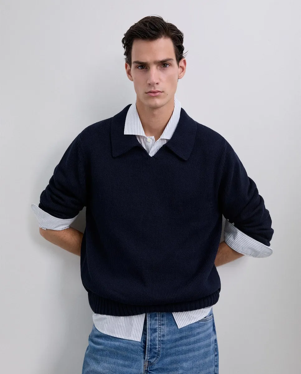Джемпер, выполненный из 100% хлопка. Длинные рукава. V-образный воротник в стиле поло. Обычная посадка.