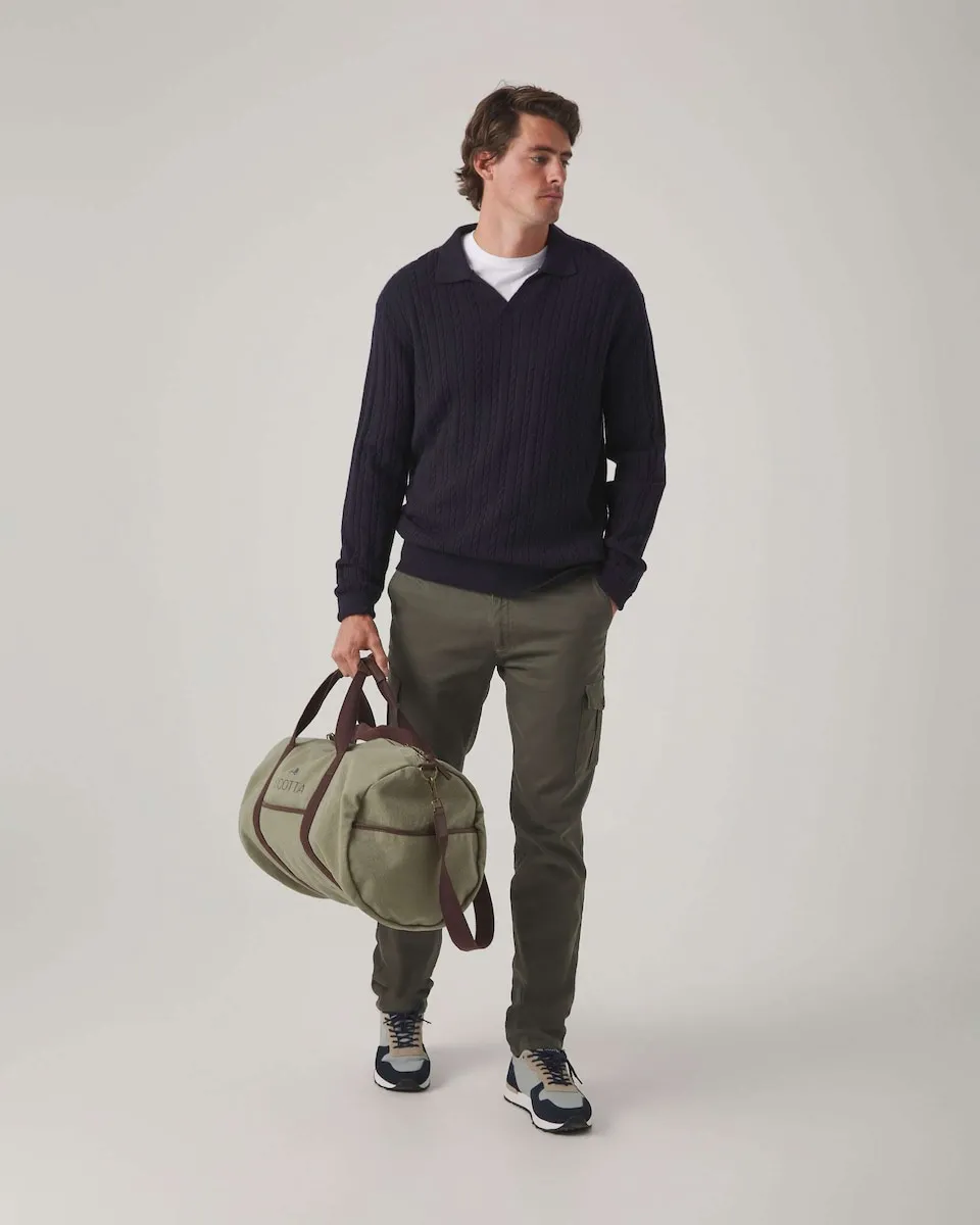 Свитер из шерсти, альпаки и переработанного нейлона. Воротник-поло и рубчик на манжетах.