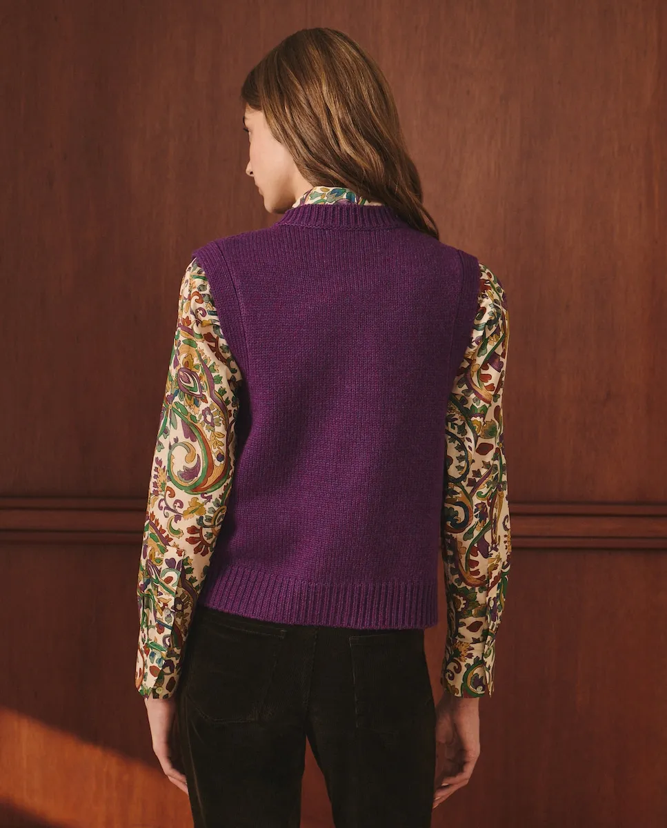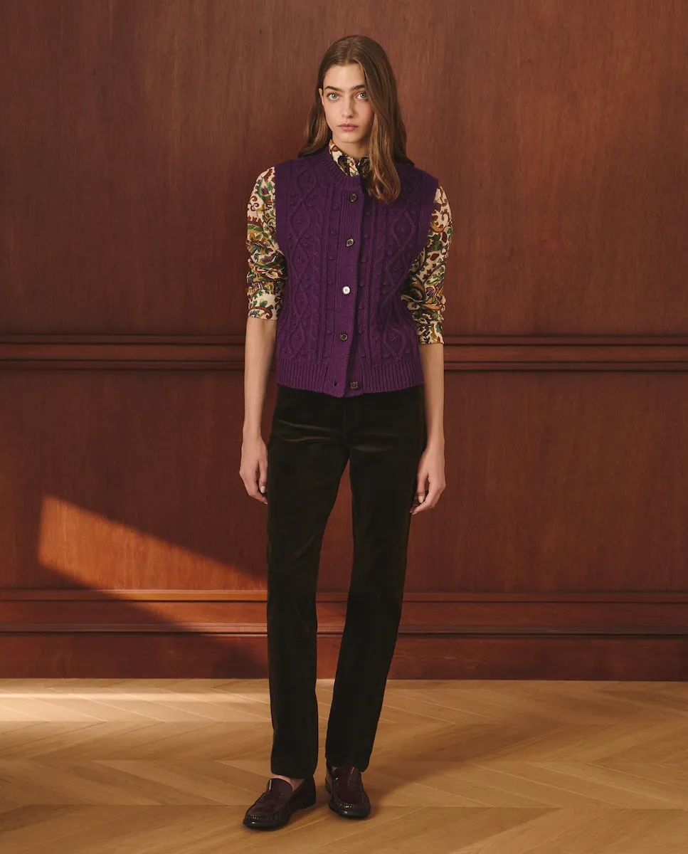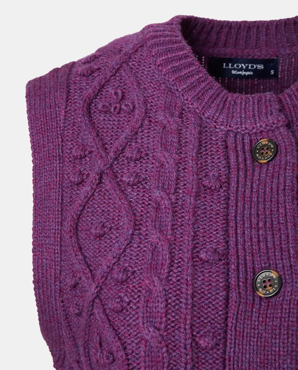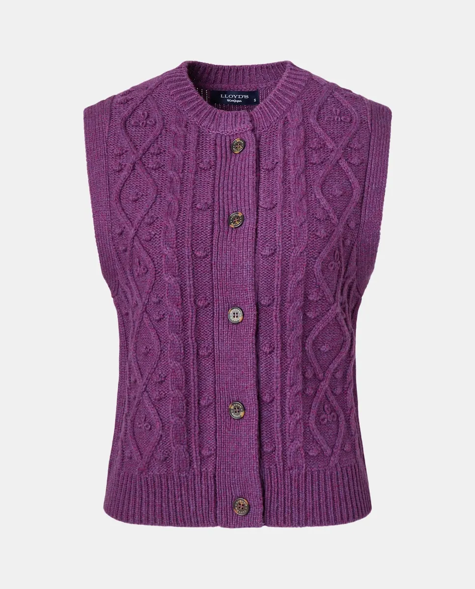 Однородный вязаный жилет на пуговицах с декоративными элементами.
