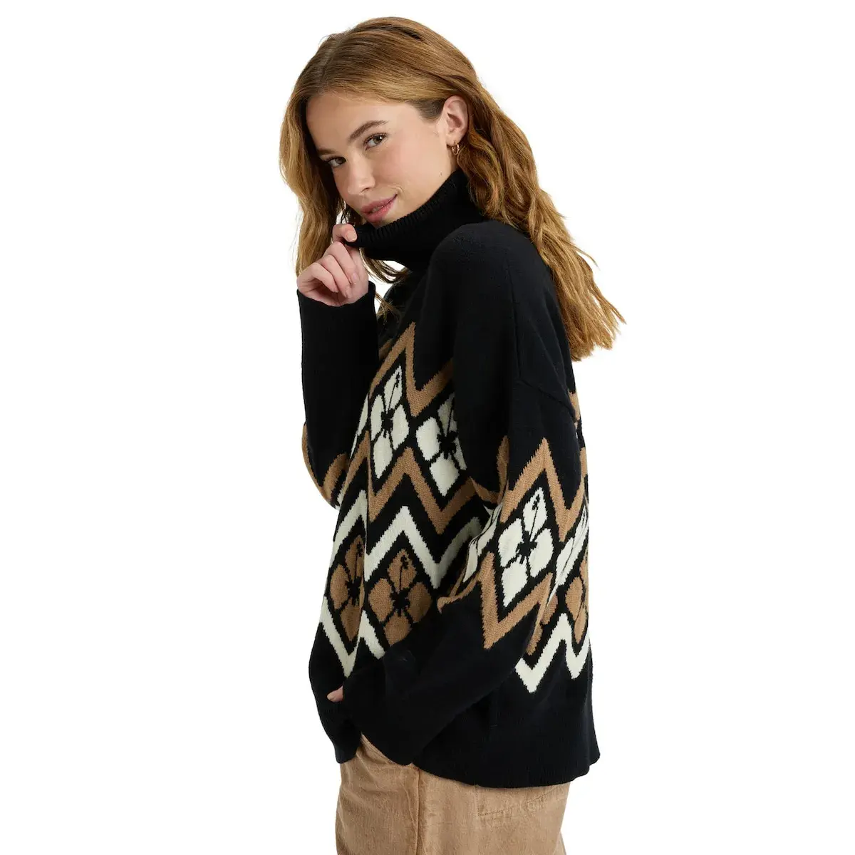 Свитер с высоким воротником для женщин. Особенности включают: ткань: нейлон, вискоза и полиэстер; крой: свободный; детали: опущенные плечи, высокий воротник и жаккардовая отделка на груди и рукавах.