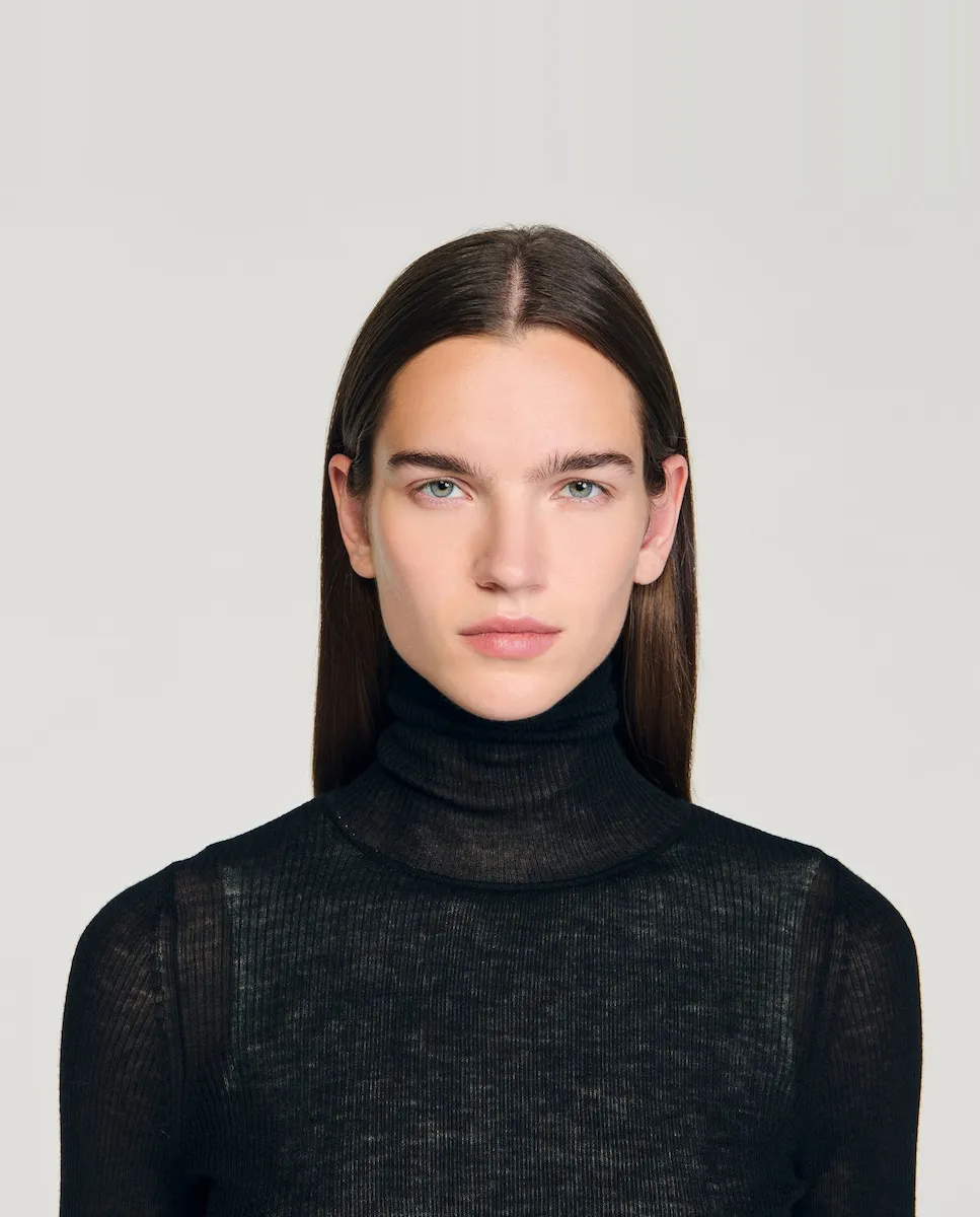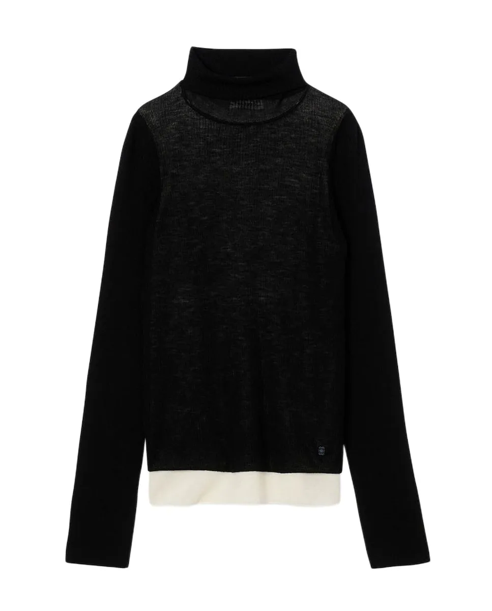 Тонкий джемпер 2 в 1 с контрастным более длинным жилетом, с высоким воротником, длинными рукавами и украшенный вышивкой логотипа в тон. Тонкий джемпер 2 в 1 Sandro для женщин. Высокий воротник. Длинные рукава. Легко прозрачная тонкая трикотажная ткань в рубчик. Внутренний контрастный жилет. Вышивка логотипа в тон.