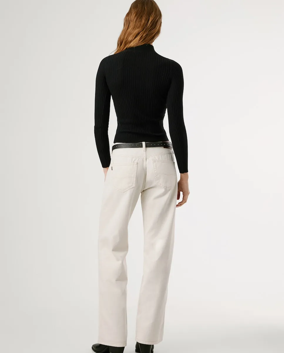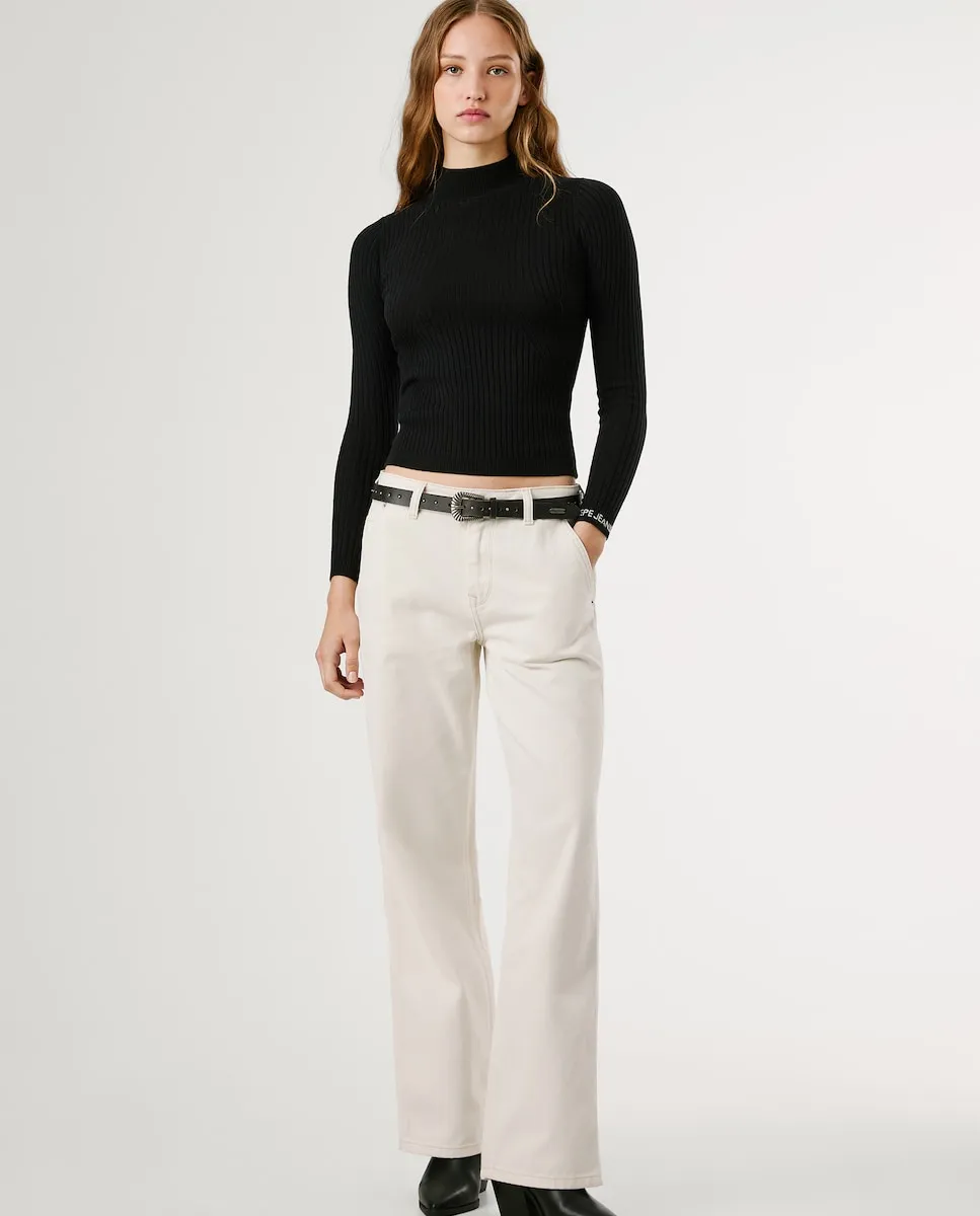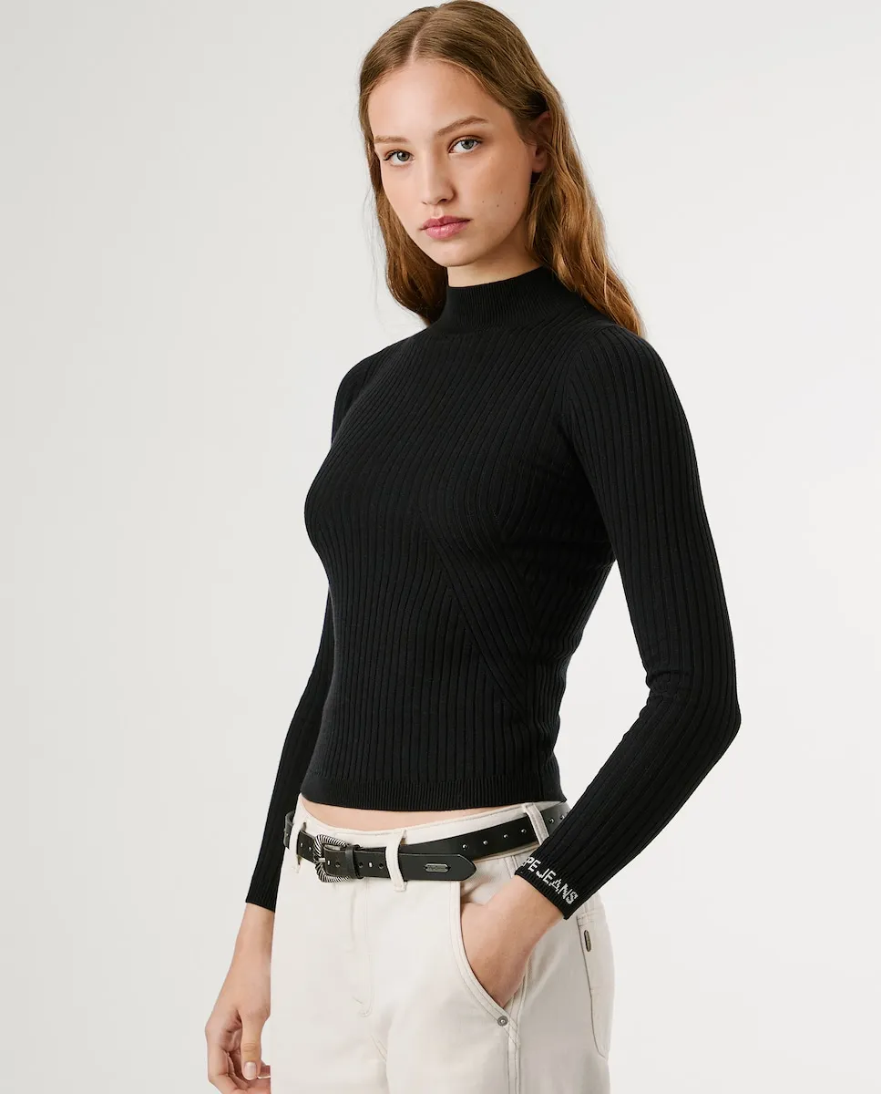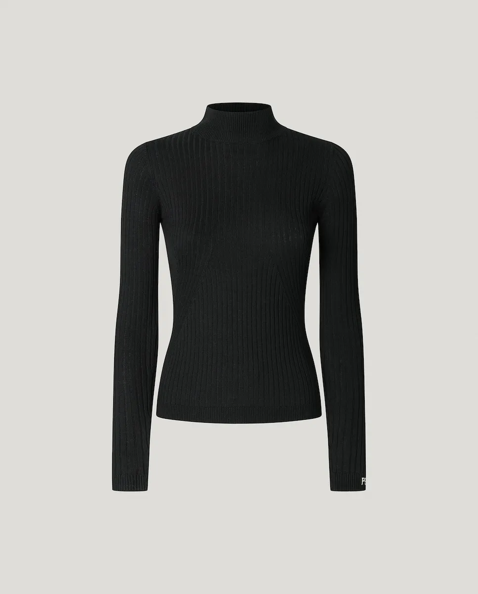 Джемпер из трикотажа в рубчик, выполненный из хлопковой смеси, с воротником Перкинс, длинными рукавами, однотонного цвета, с логотипом PEPEJEANS, вышитым методом интарсия на левом манжете, и более тонкой отделкой в рубчик на воротнике, манжетах и подоле.