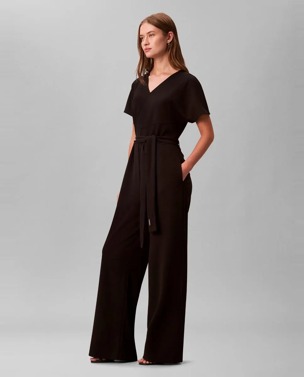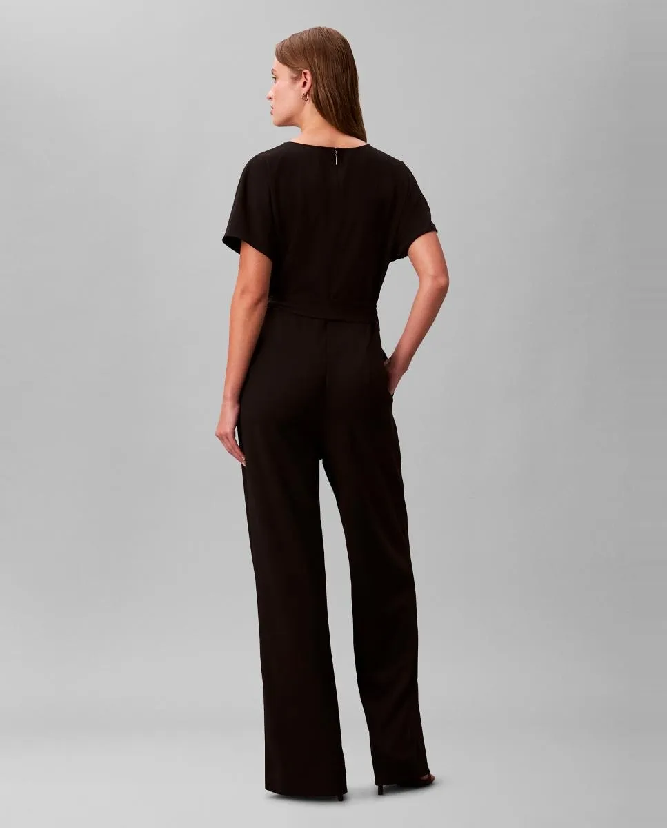 Женский комбинезон из крепа от Calvin Klein, изготовленный из полиэстера и эластана, с короткими рукавами и поясом, застежка-молния на спине.