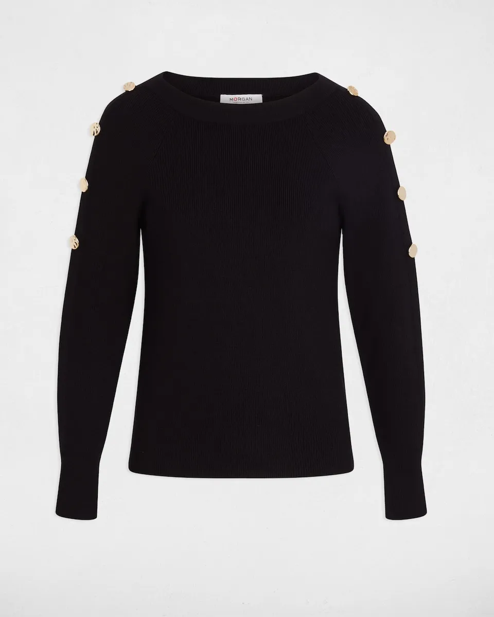 Джемпер с открытым вырезом. Прямой крой. Вырез лодочка. Длинные рукава. Тонкая вязка. Декоративные пуговицы на плечах