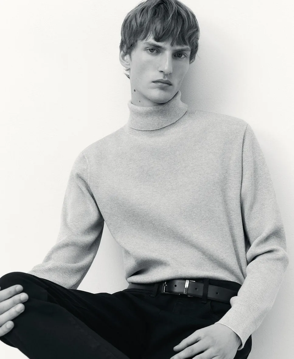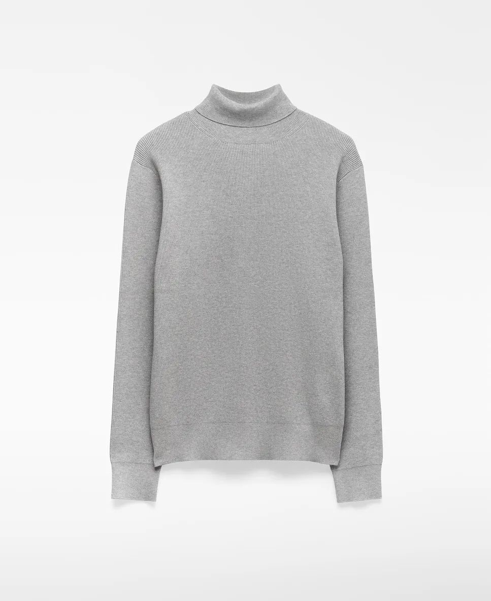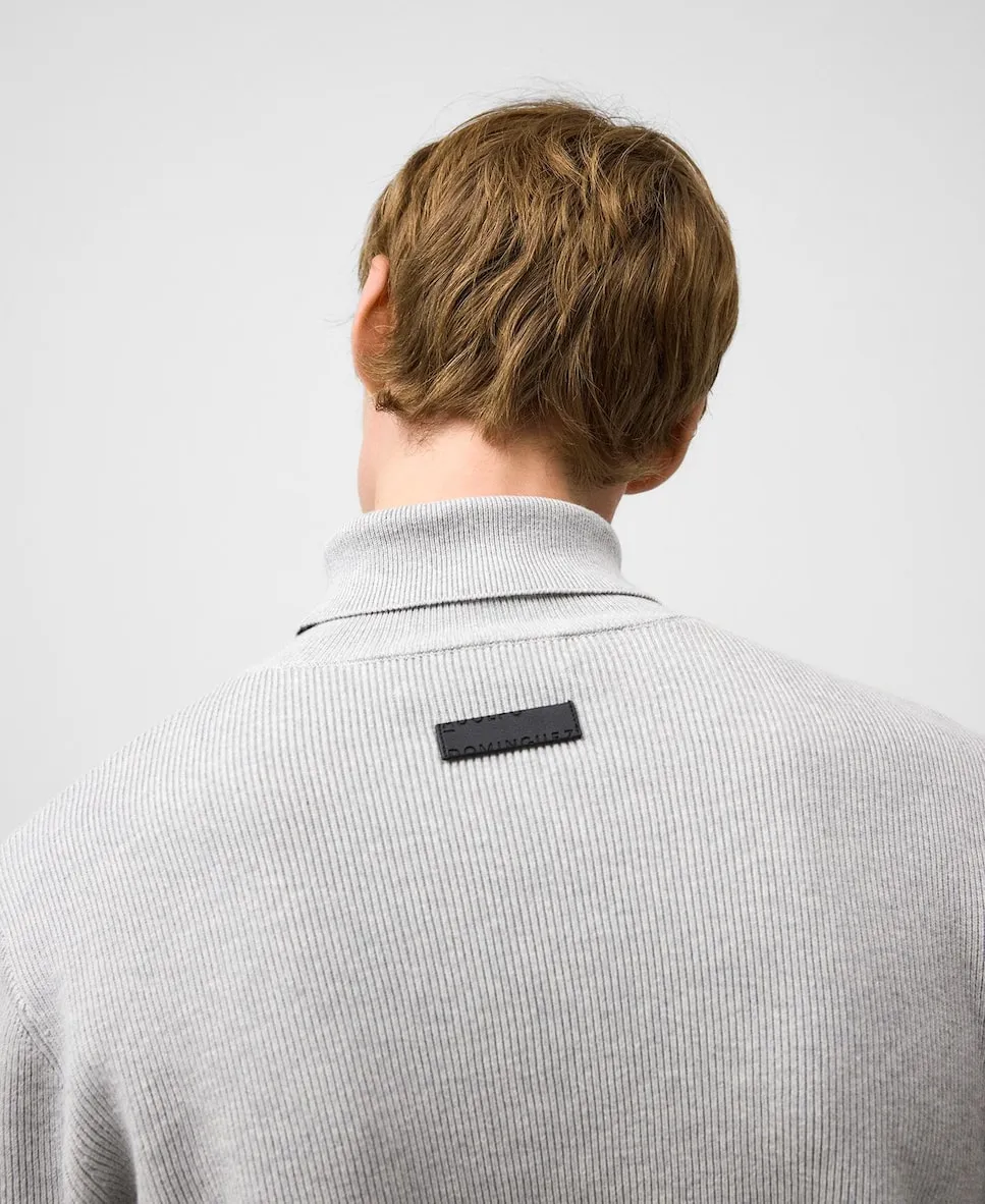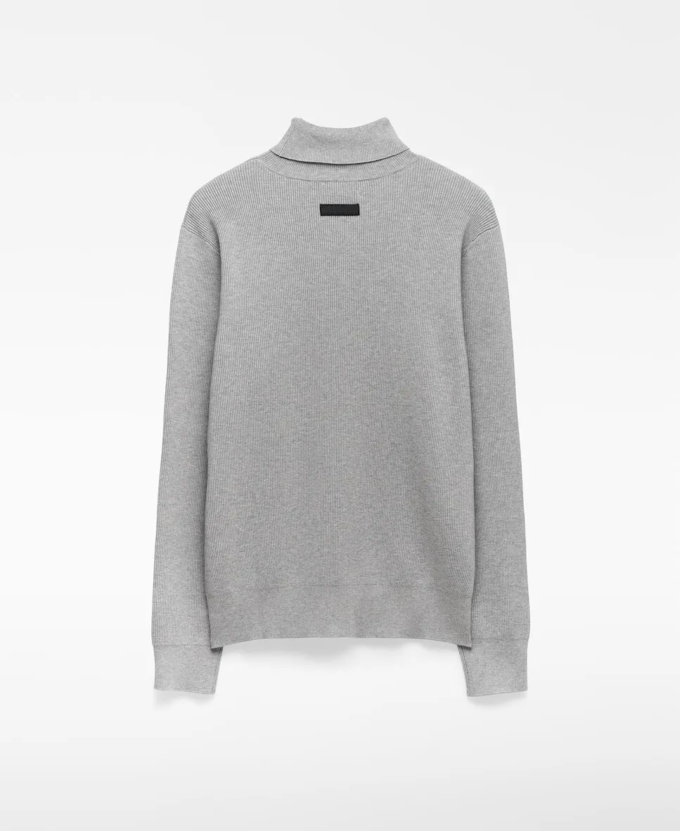 Джемпер из вареного трикотажа из органического хлопка с высоким воротником. Имеет длинные рукава, рифленые отделки и наружную логотипированную этикетку на спине.