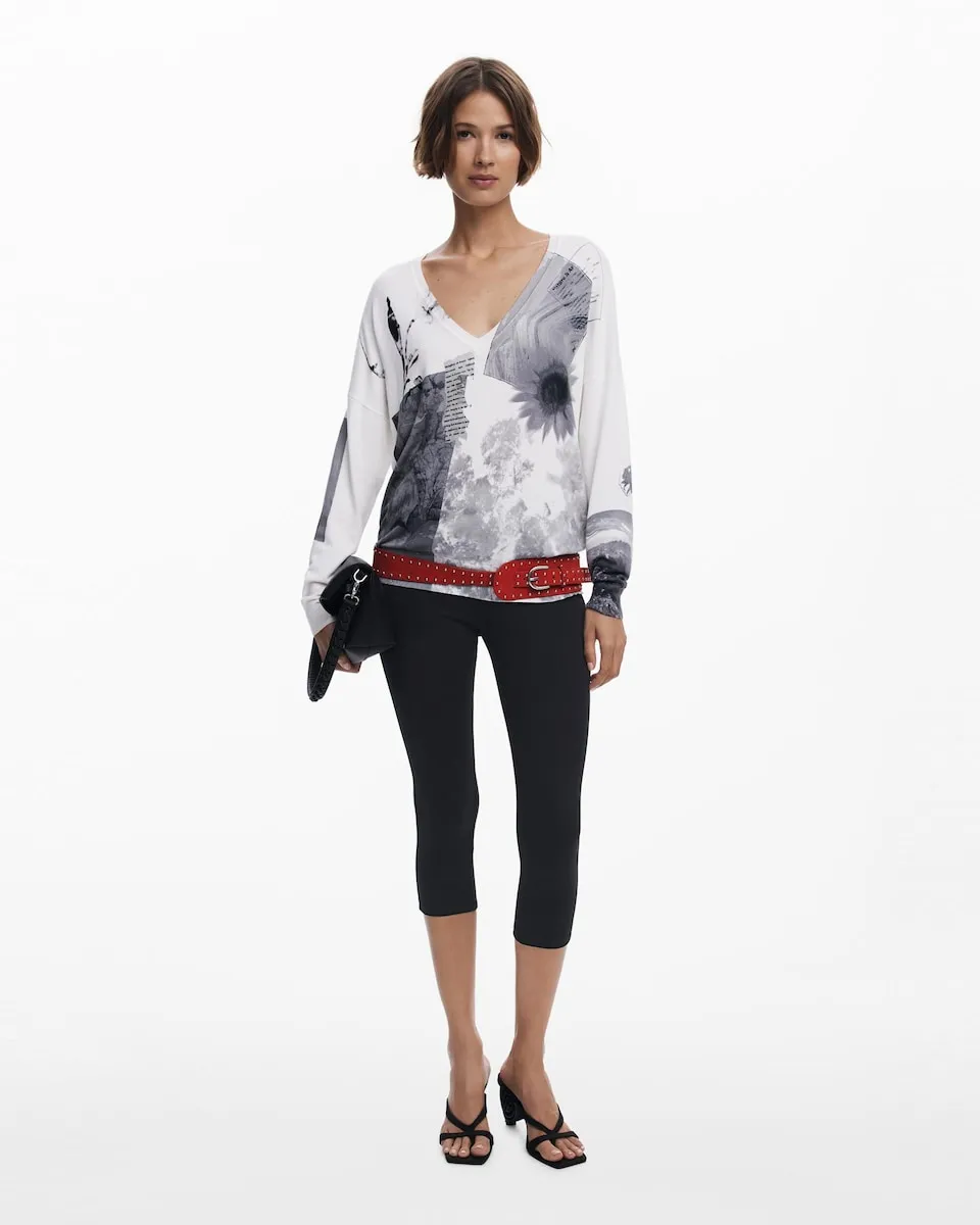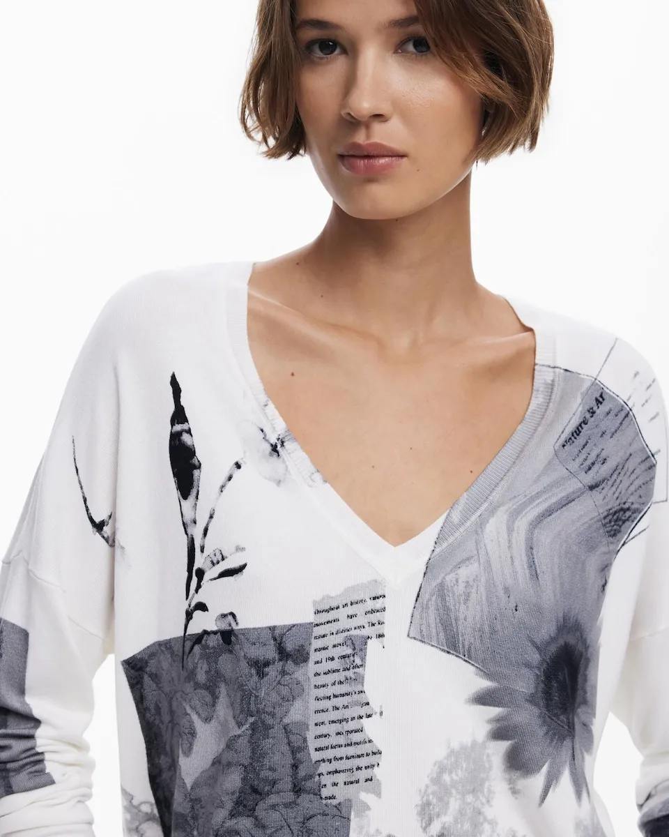 Тонкий свитер свободного кроя с длинными рукавами и V-образным вырезом, с фотопринтом в стиле коллажа. Арт-принт. Крой: свободный. Вырез: V-образный. Рукав: длинный. Легкая ткань. Принт коллаж. Коллекция AW25. Разработан в Барселоне. ИСТИННО.