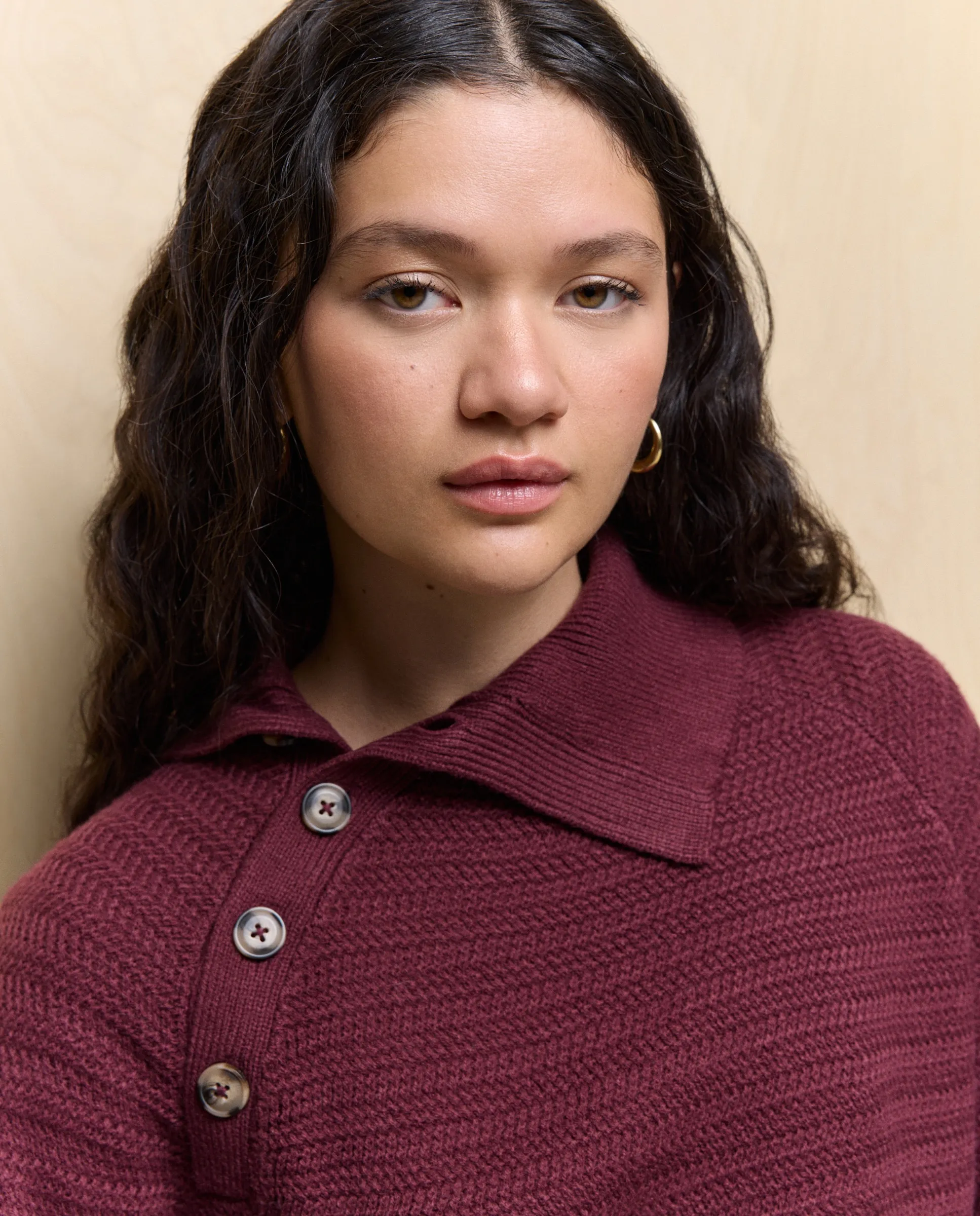 Свитер с полосатым узором и открытым воротником на пуговицах.