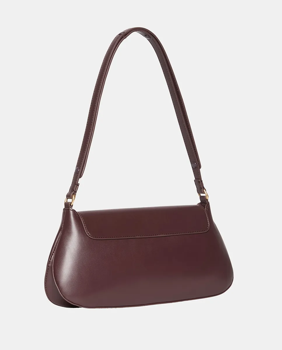 Плечная сумка бордового цвета с клапаном и застежкой-пряжкой с украшением.