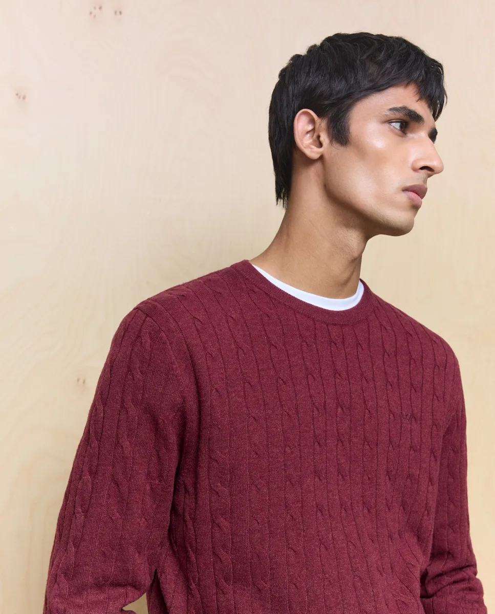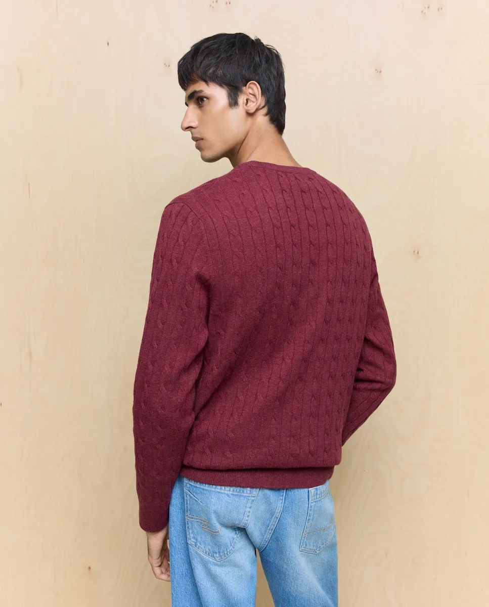 Мужской джемпер с круглым вырезом, вязанный с узором «косы» на передней части, рукавах и спине. Выполнен из овечьей шерсти (lambswool), можно стирать в машине.