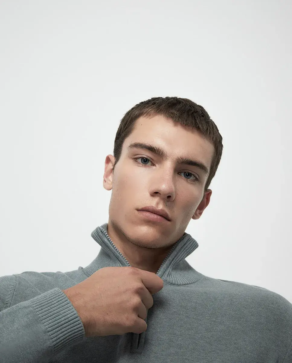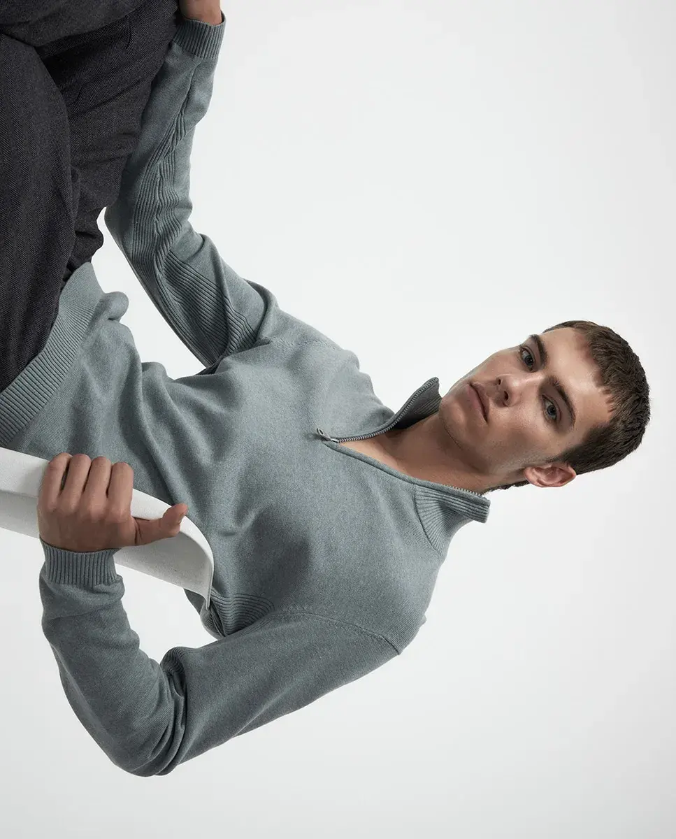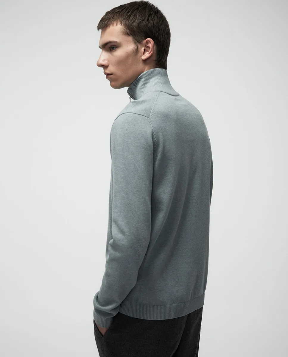 Вязаный свитер с высоким воротником, с застежкой-молнией и длинными рукавами. Отделка в рубчик, ткань 100% хлопок.