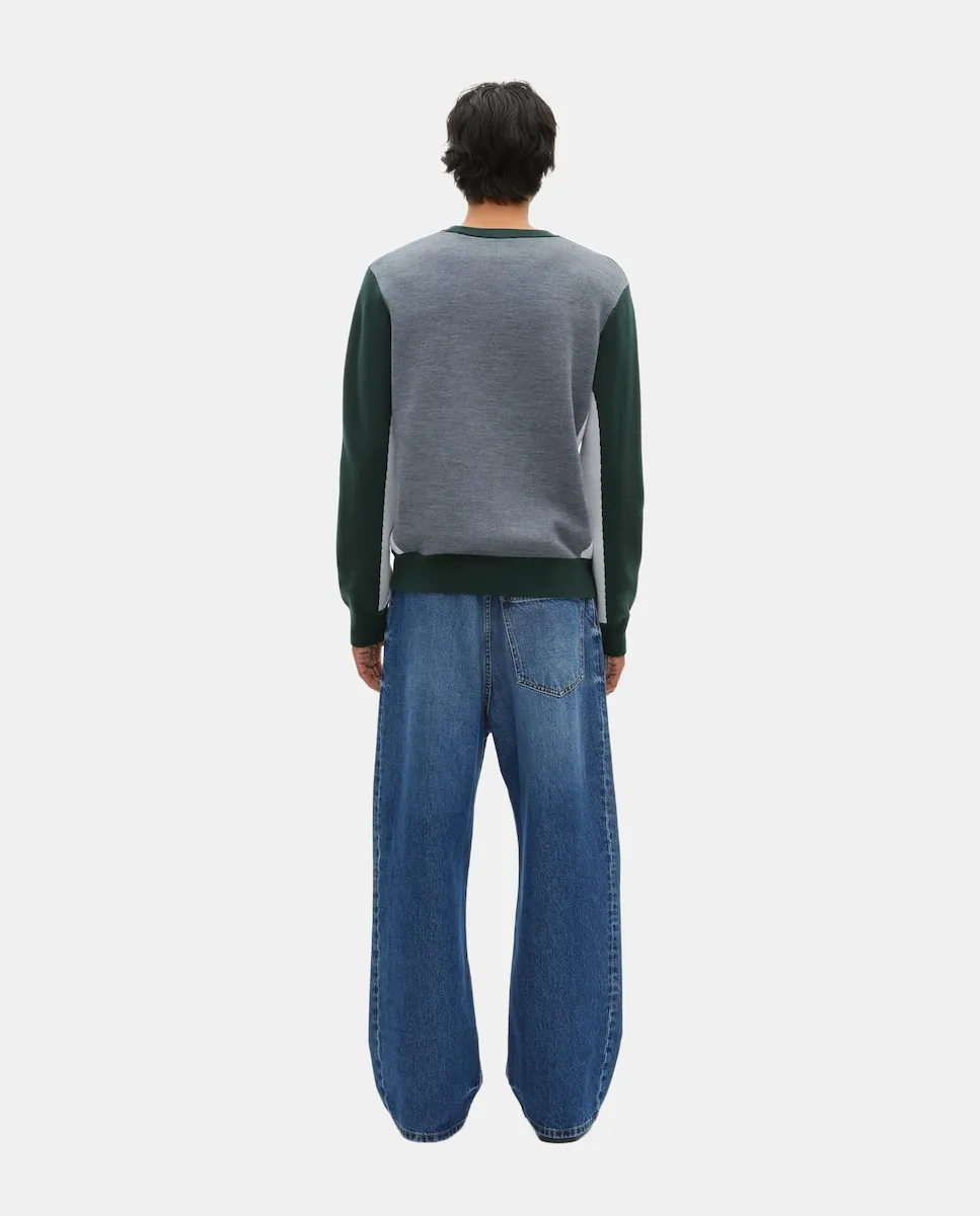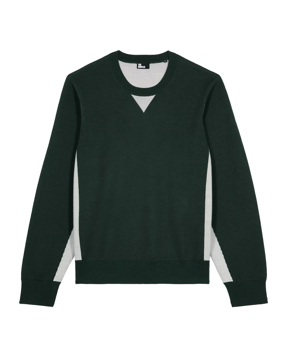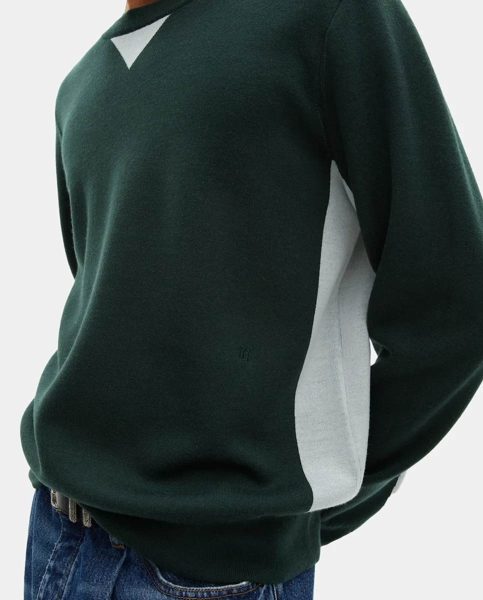 Мужской свитер The Kooples прямого кроя, с круглым вырезом и длинными рукавами. На боковых частях и спине есть контрастный цвет, края связаны резинкой.