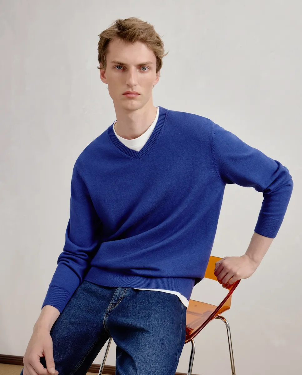 Мужской базовый джемпер с V-образным вырезом из переработанной шерсти.