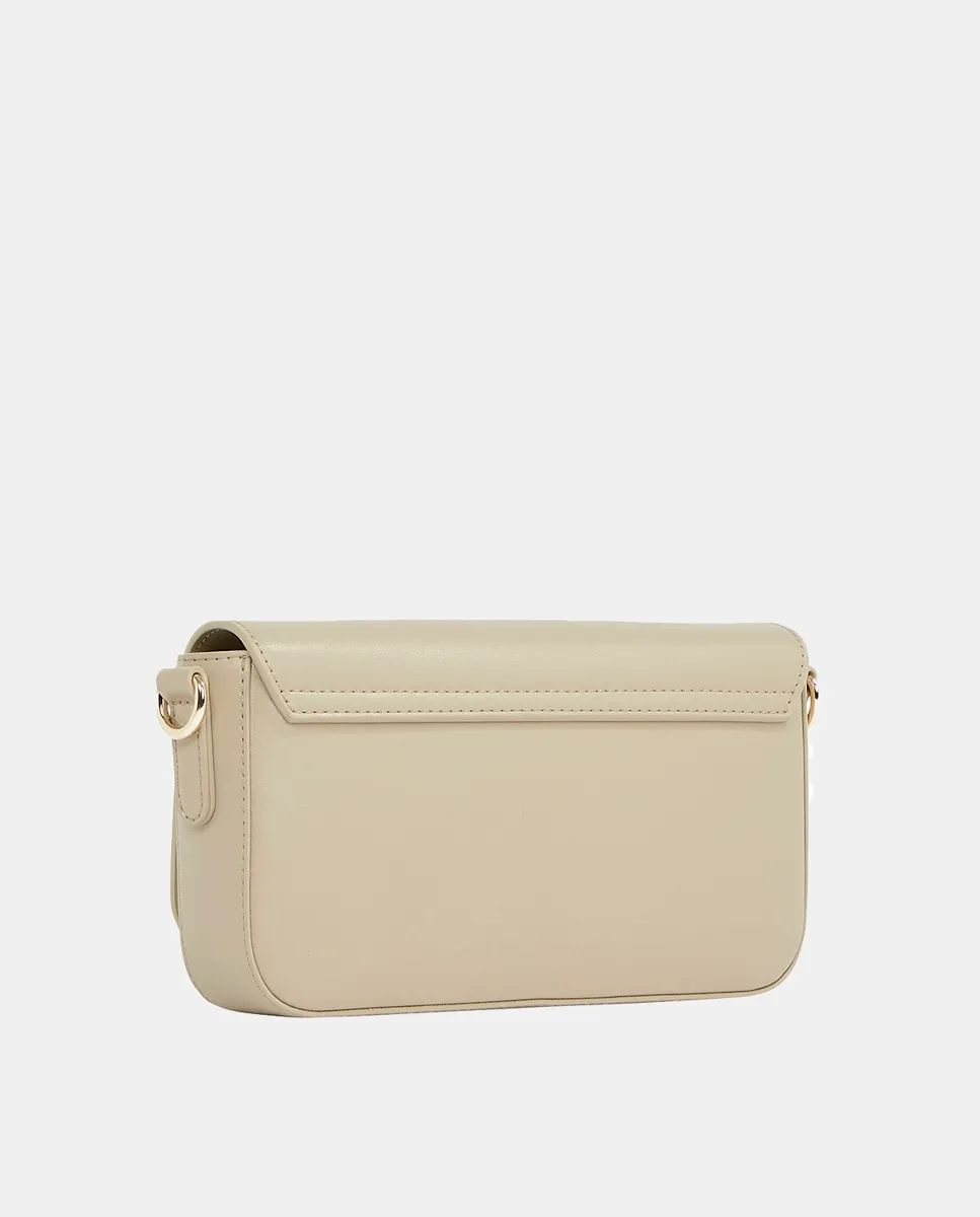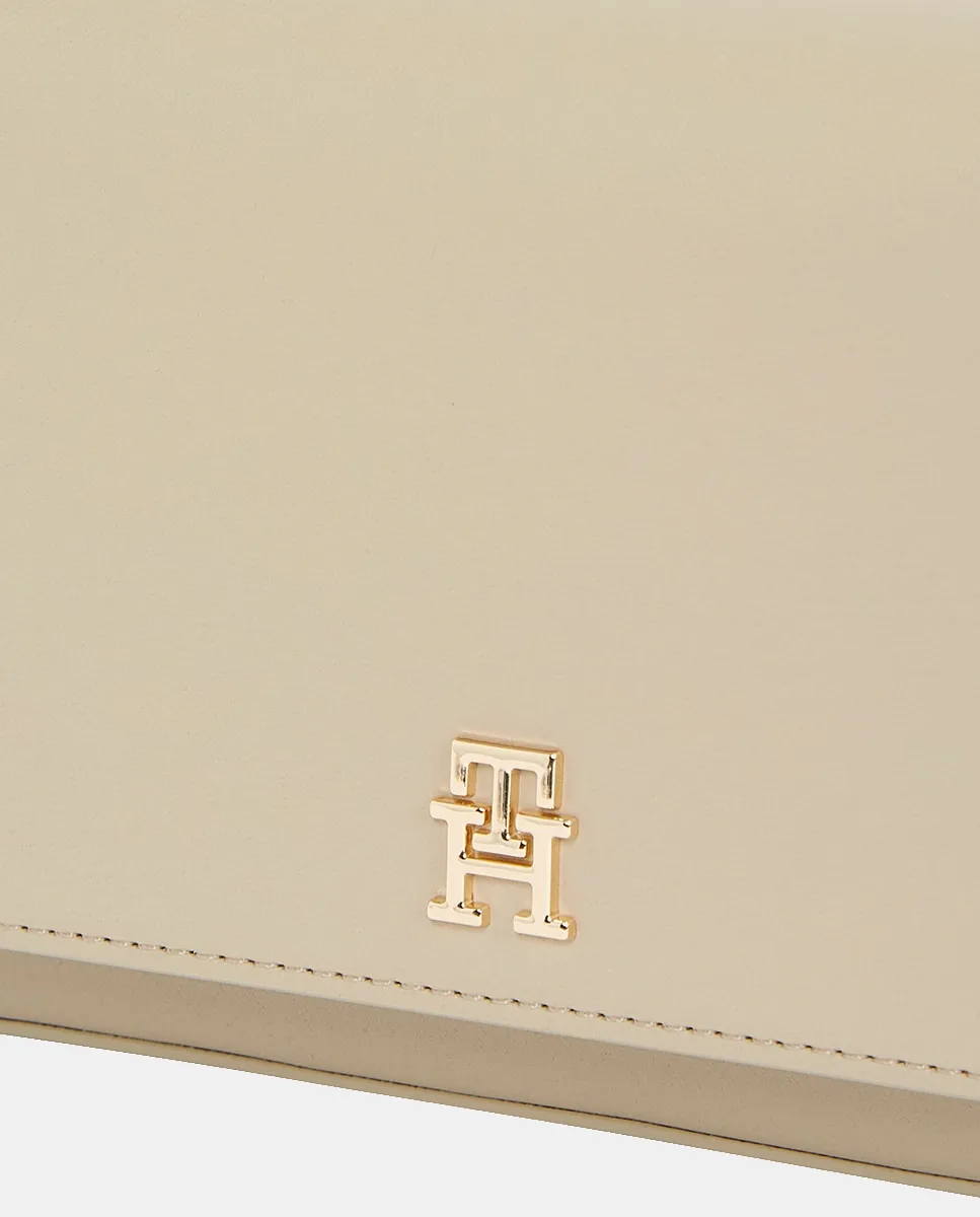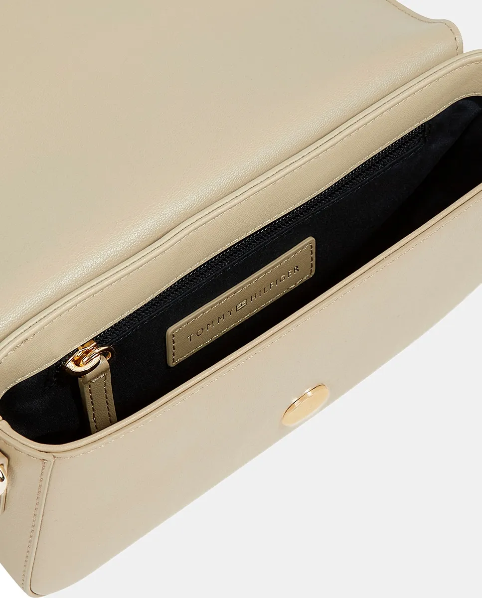 Женская сумка через плечо, выполненная из экокожи кремового цвета. Дизайн с клапаном и застежкой, регулируемый ремень через плечо и металлический логотип Tommy Hilfiger на передней части.