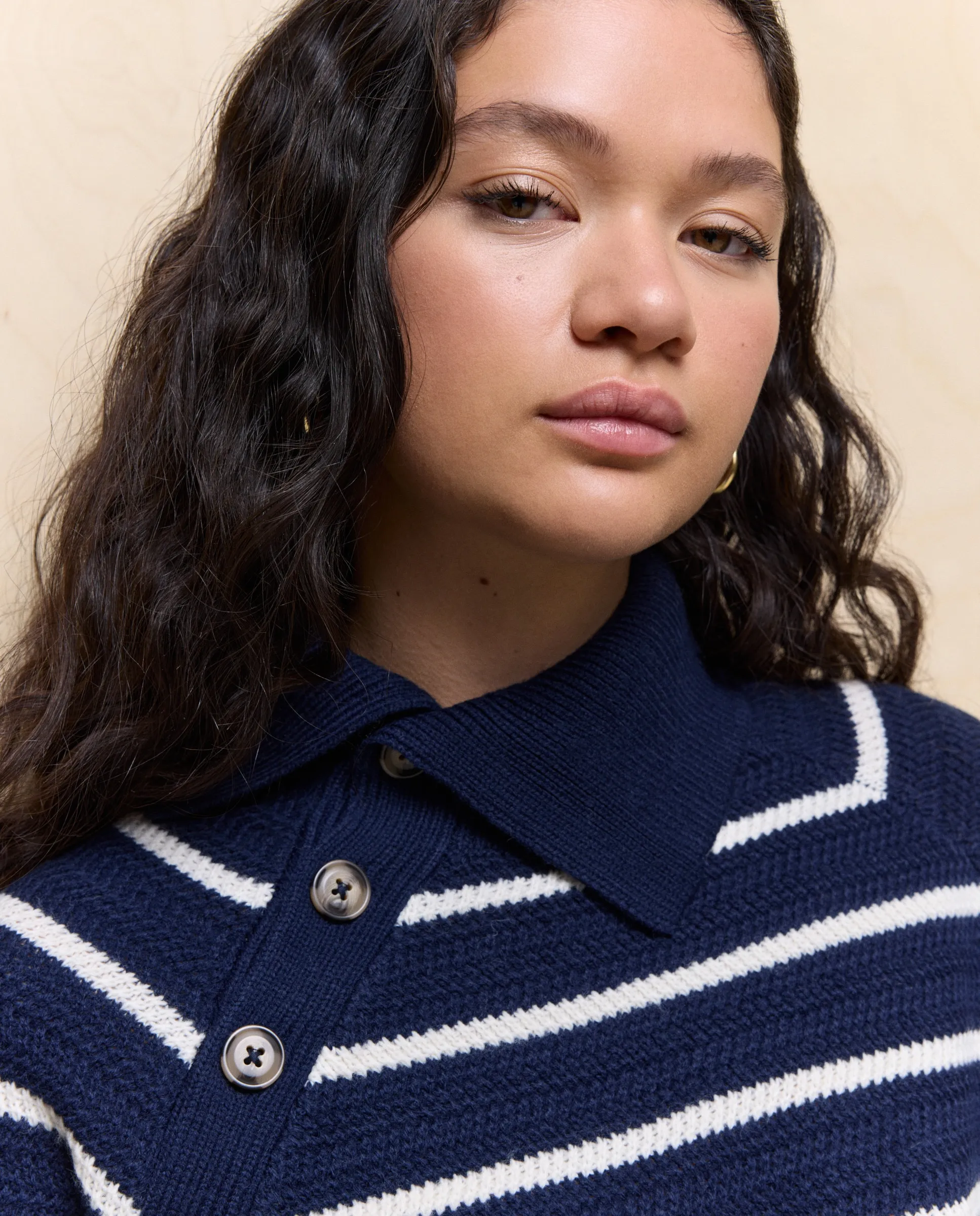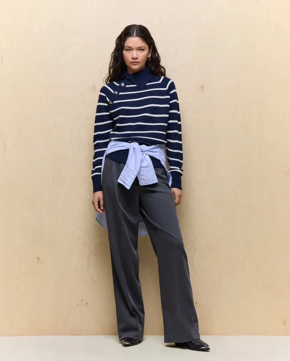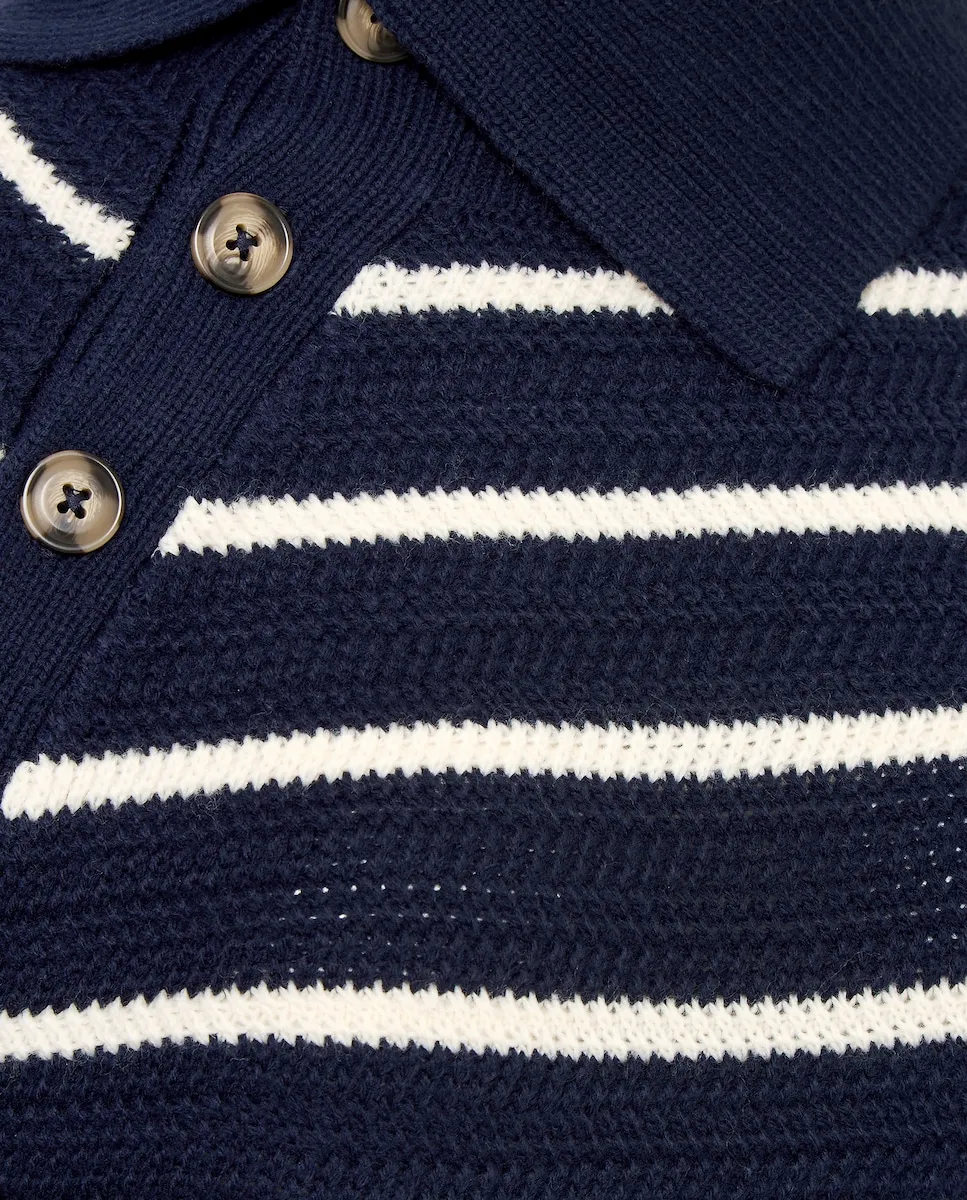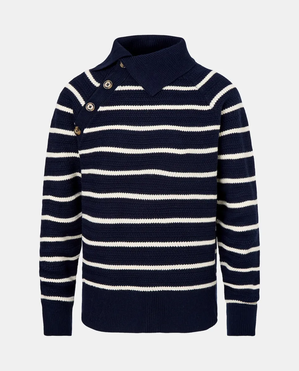 Свитер с полосатым узором и открытым воротником на пуговицах.