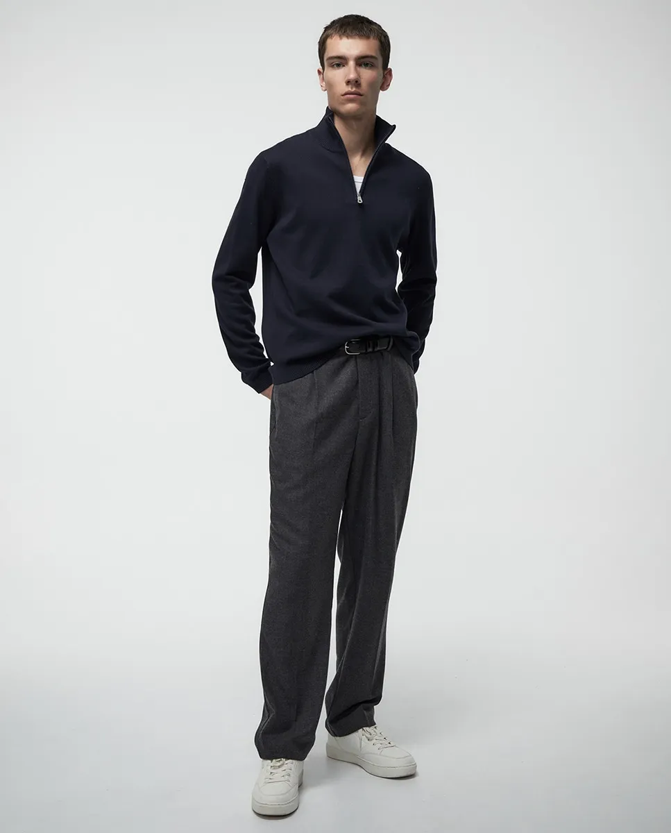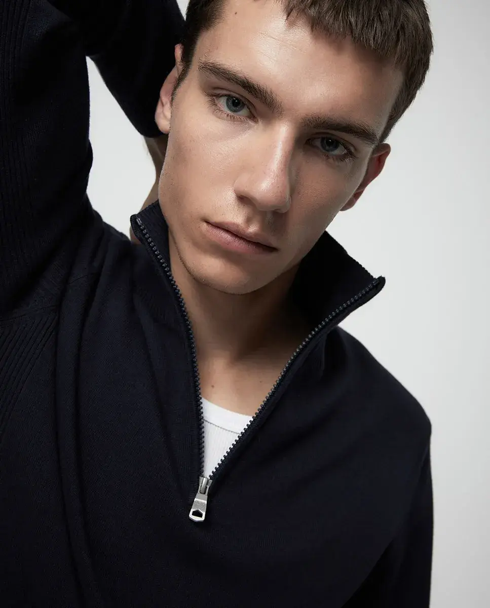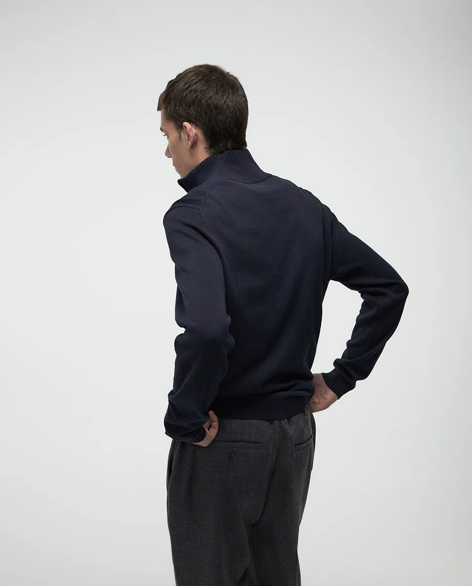 Вязаный свитер с высоким воротником, с застежкой-молнией и длинными рукавами. Отделка в рубчик, ткань 100% хлопок.