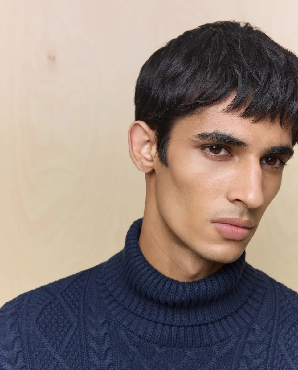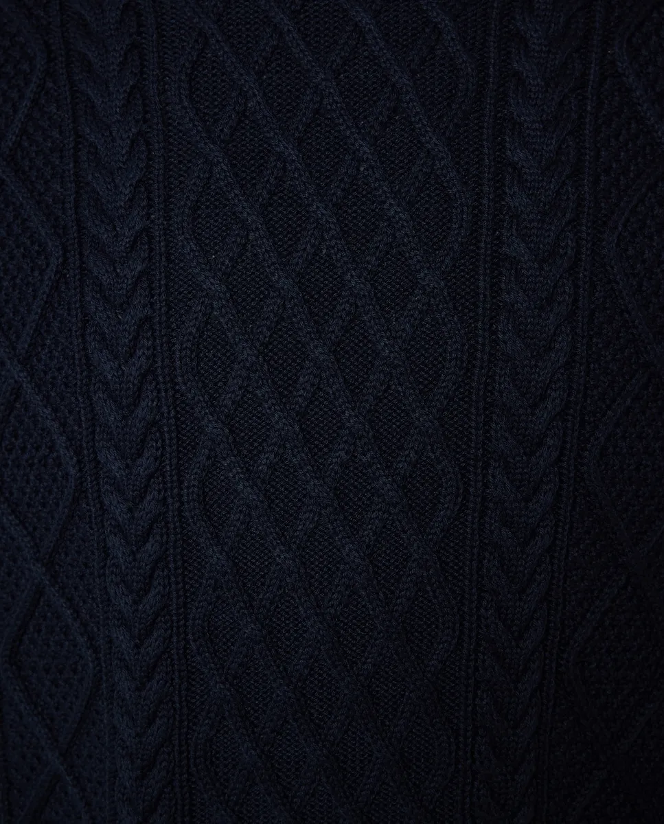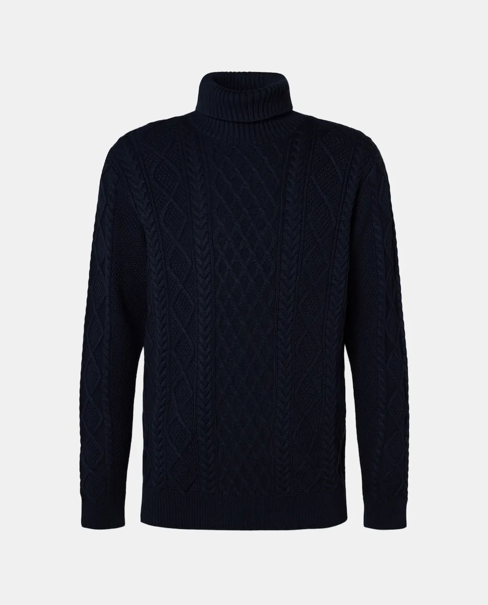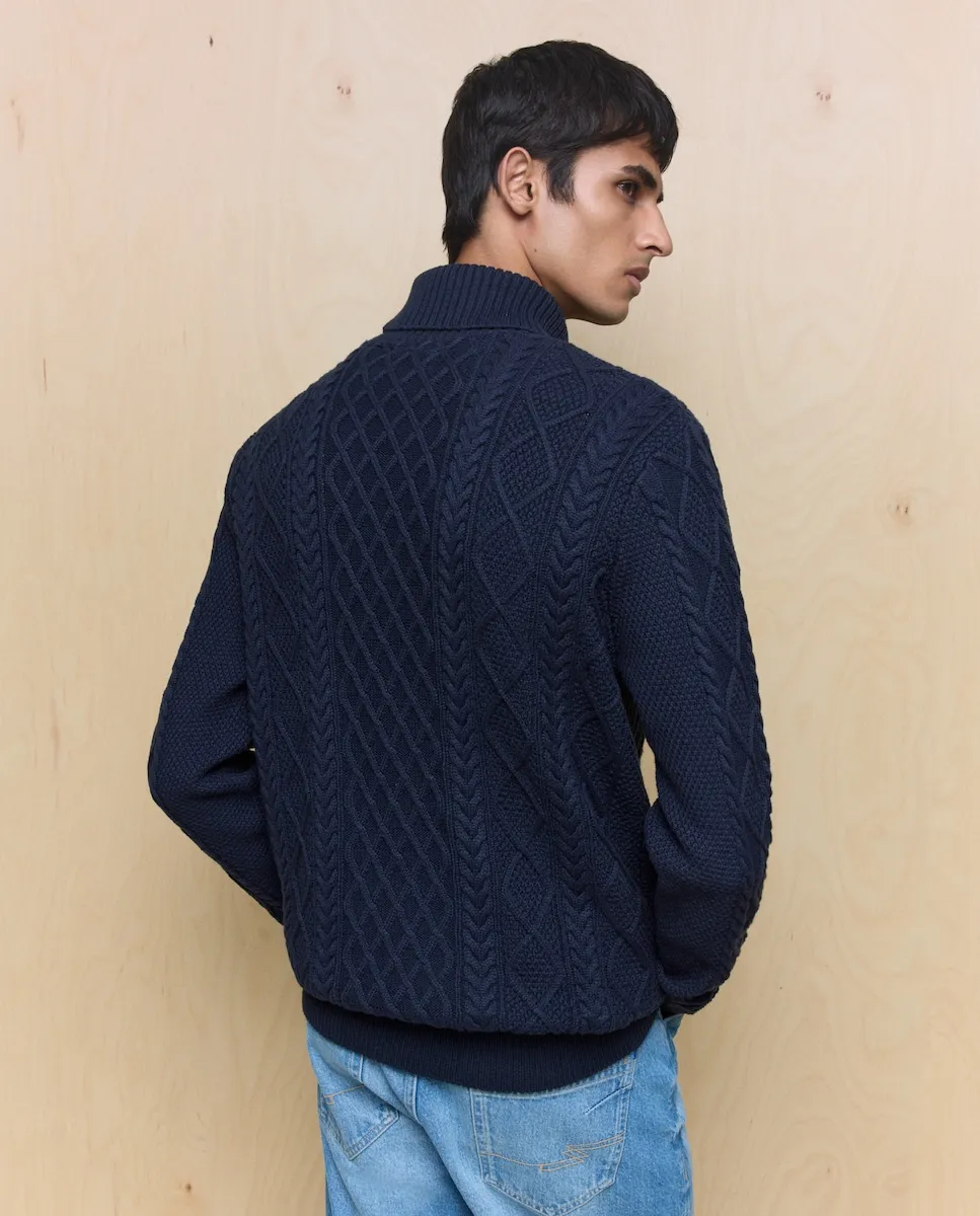 Мужской джемпер с высоким воротом. Связан узором «араны» на передней части, рукавах и спинке.