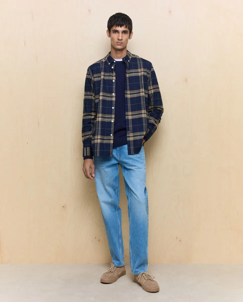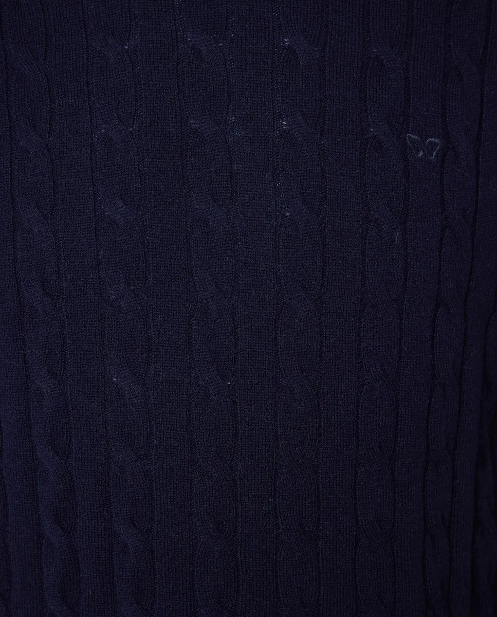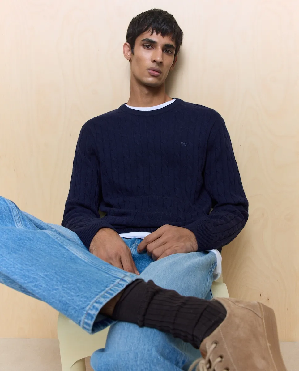 Мужской джемпер с круглым вырезом, вязанный с узором «косы» на передней части, рукавах и спине. Выполнен из овечьей шерсти (lambswool), можно стирать в машине.