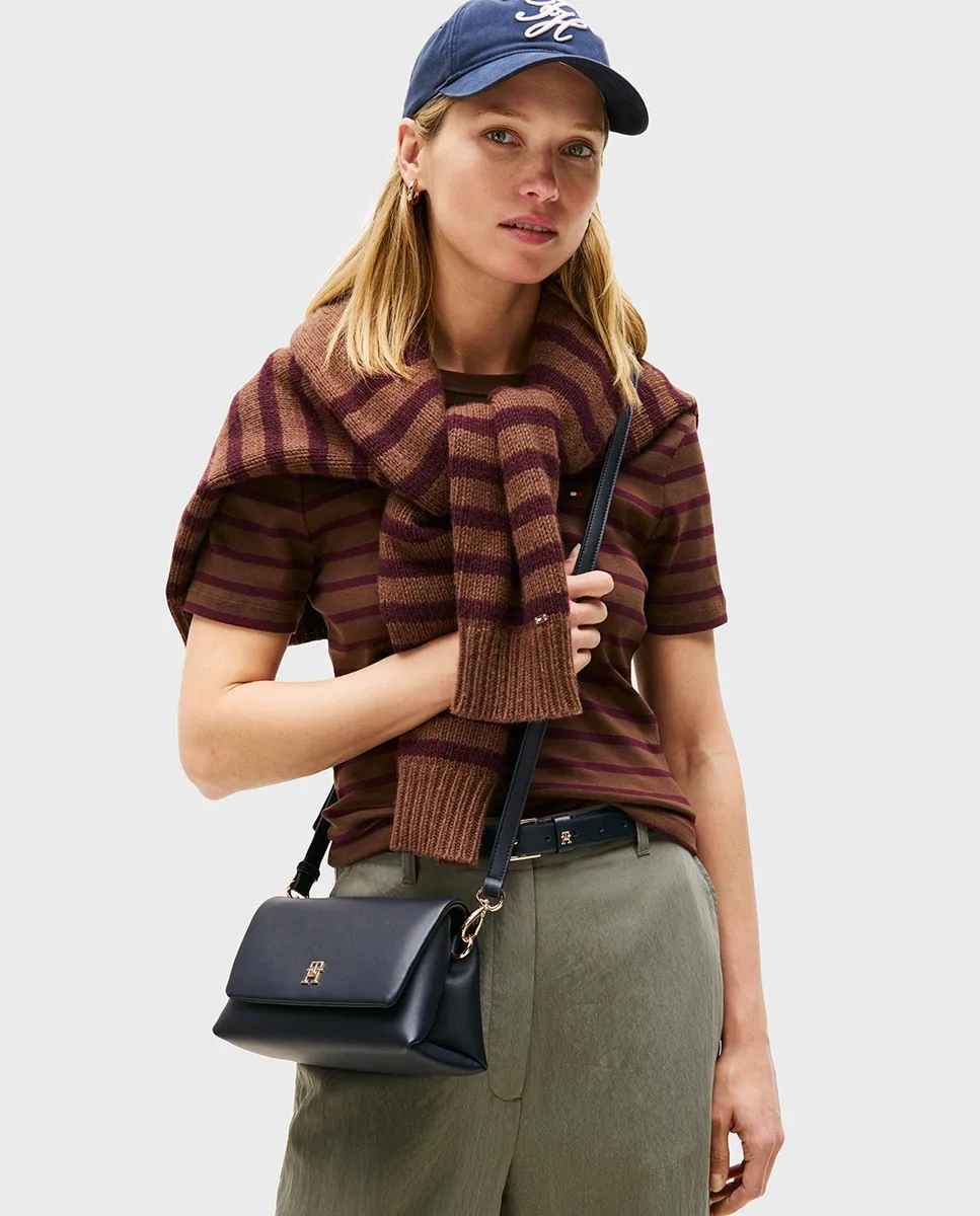 Женская сумка через плечо из экокожи темно-синего цвета. Дизайн с клапаном, регулируемым ремнем и металлическим логотипом Tommy Hilfiger на передней части.
