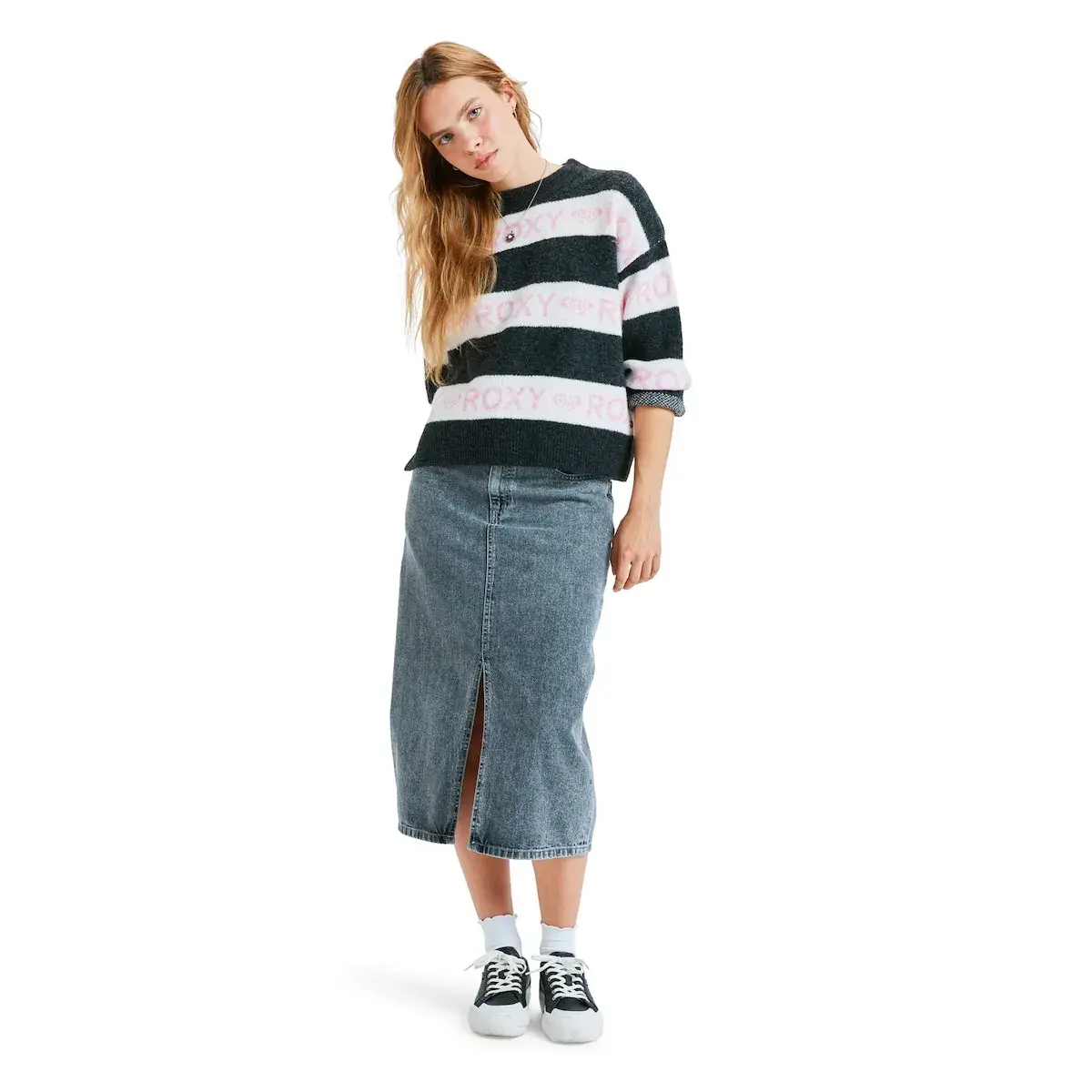 Женский джемпер с закрытой передней частью. Характеристики включают: Ткань: смесь полиэстера, акрила, шерсти и эластана, Крой: свободный и укороченный, Падение плеч, Ребристая вязка вокруг горловины, по низу изделия и на рукавах, Полосы, окрашенные в нить, и жаккардовая надпись на передней и задней частях.