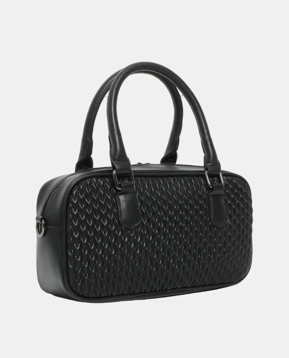 Сумка боулинг с плиссировкой, черного цвета, с ручками для рук, съемным и регулируемым плечевым ремнем для носки на плече и через плечо, застежка-молния, 2 внутренних кармана.