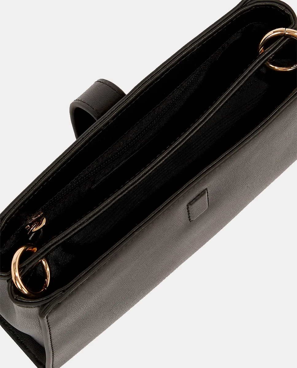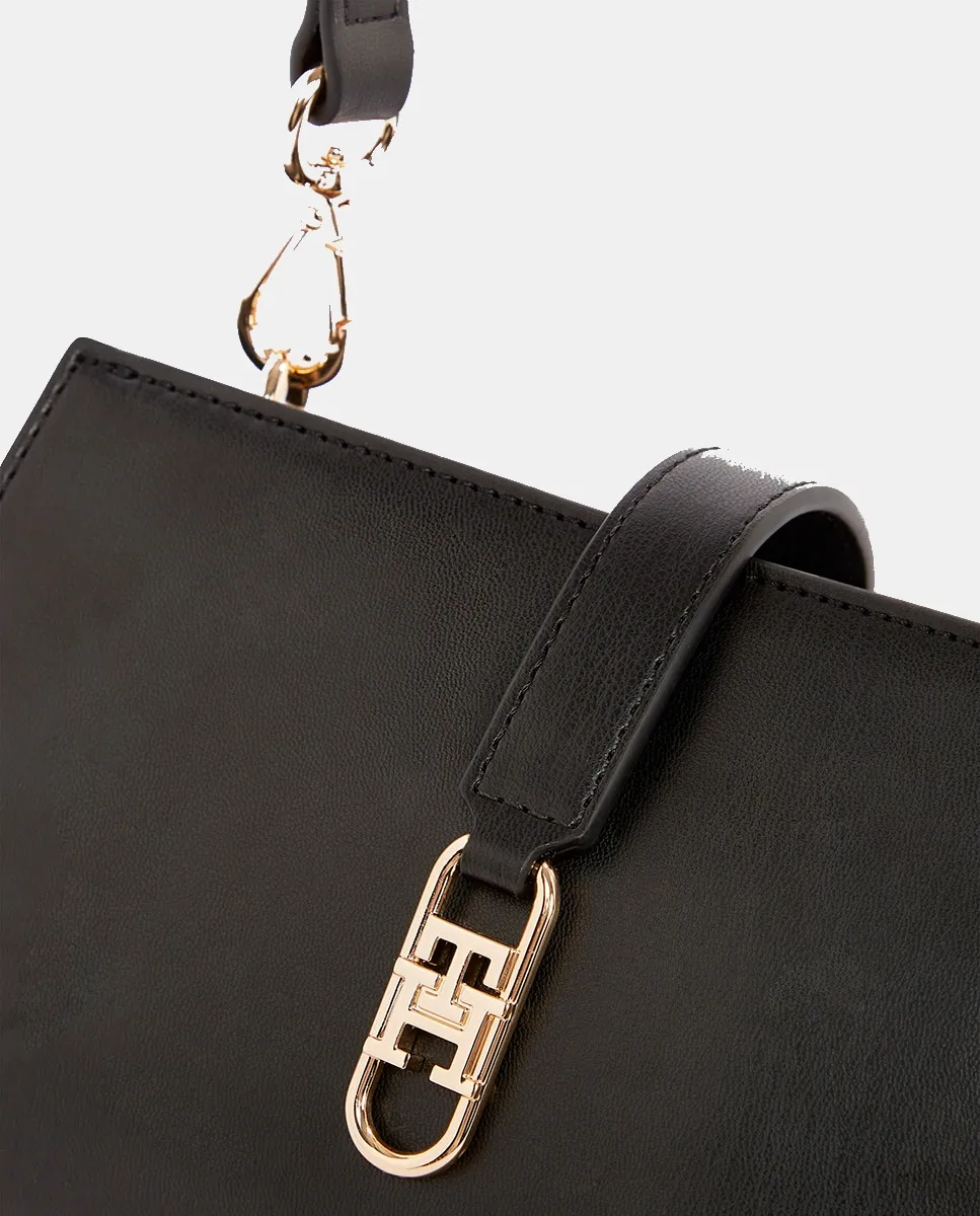 Женская сумка через плечо, выполненная из экокожи черного цвета. Дизайн с клапаном и застежкой, ручкой и регулируемым ремнем через плечо. Деталь с логотипом Tommy Hilfiger на застежке.