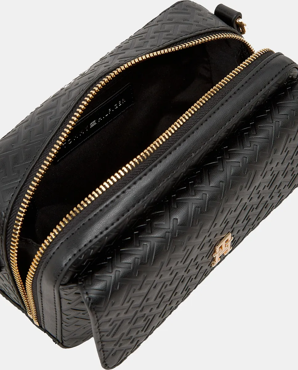 Сумка через плечо для женщин, изготовленная из экокожи черного цвета с монограммой. Модель с застежкой-молнией, регулируемым ремнем через плечо и внешним карманом. Металлический логотип Tommy Hilfiger на передней части.