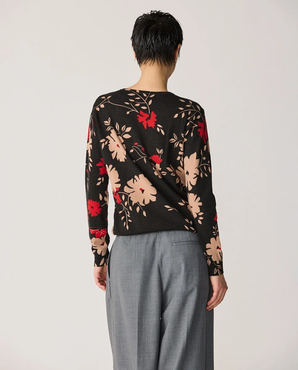 Джемпер с V-образным вырезом и цветочным принтом в красных и бежевых тонах на черном фоне - это предмет гардероба, который идеально сочетает утонченный и смелый стиль. Его прямой, но удобный крой тонко и элегантно подчеркивает фигуру, а яркий цветочный принт делает его центральной деталью, которая не остается незамеченной.