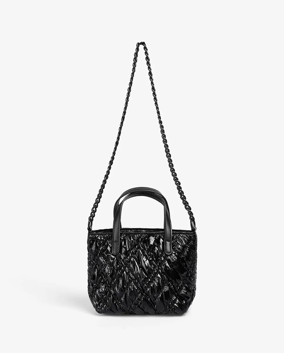 Сумка-шоппер из полиамида с блестящей отделкой. Две ручки, короткая и длинная цепочная, съемная. Верхняя застежка на молнии. Внутри подкладка с карманом на молнии и дополнительным отделением. Металлический логотип спереди.