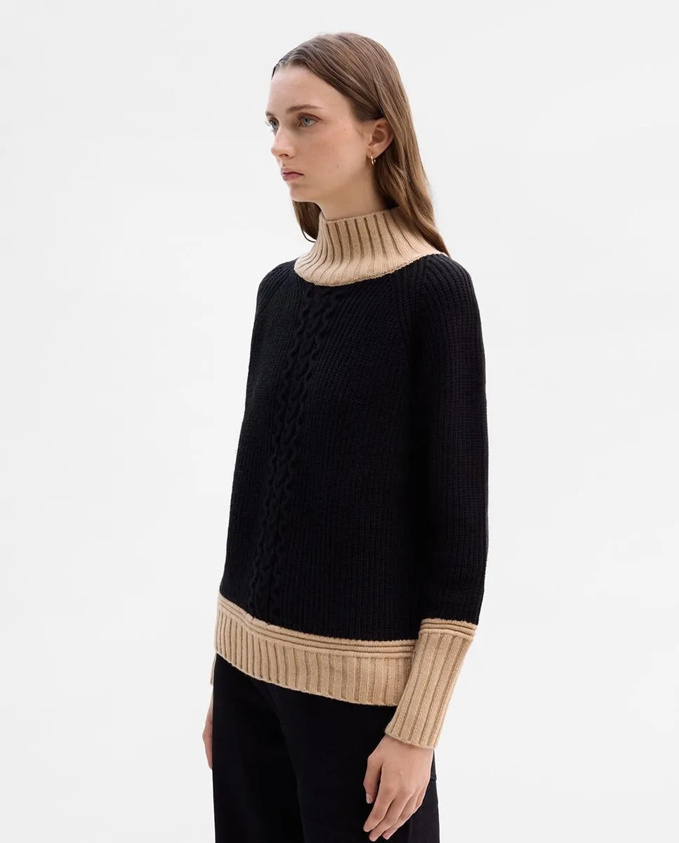 Свободный свитер крупной вязки с воротником-стойкой и длинными рукавами. Декор с узором «косы» посередине. Воротник и края с контрастным цветом.