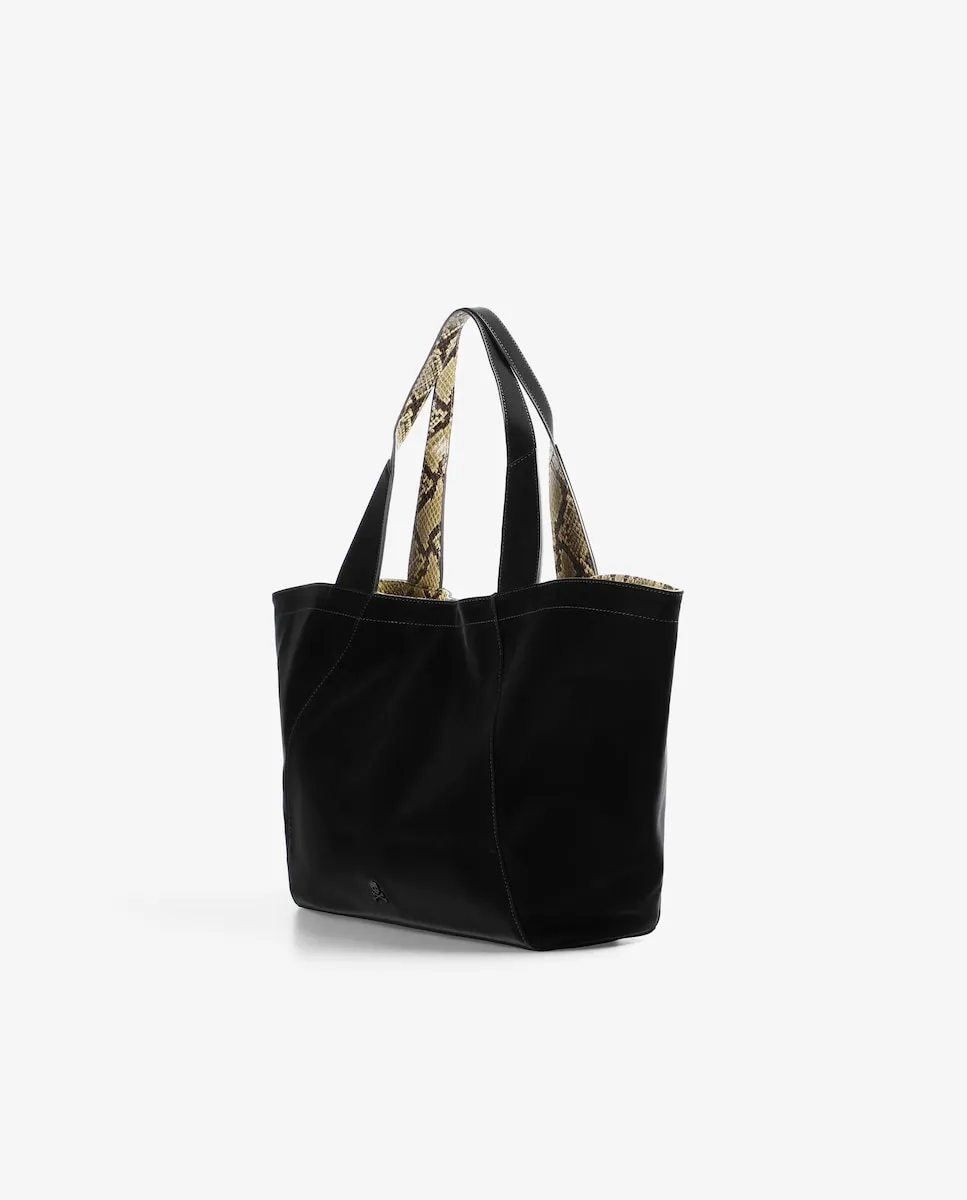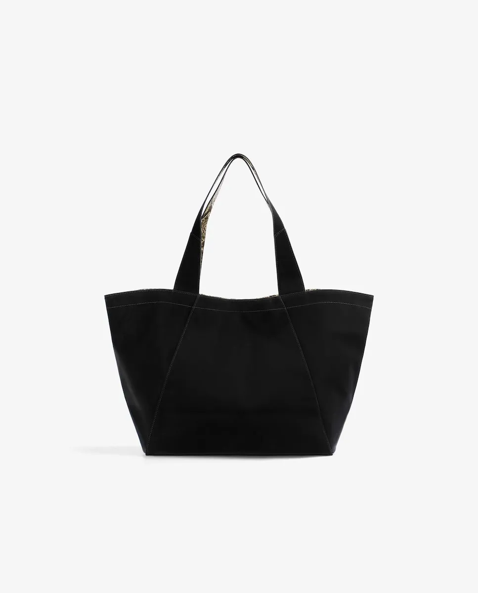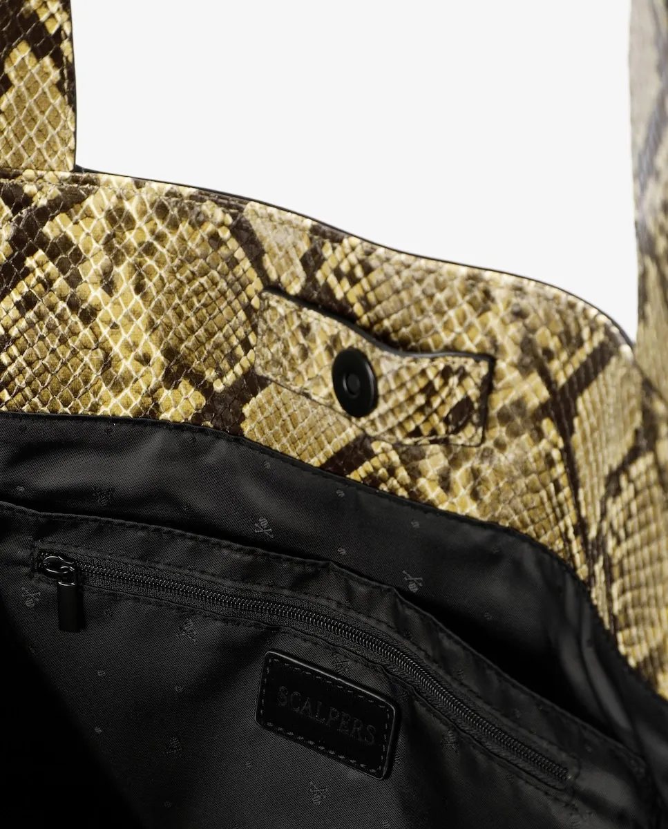 Сумка-шоппер, выполненная из смеси хлопка и полиуретана с подкладкой из полиэстера. Просторный дизайн с внутренним принтом в стиле «animal print». Двойные ручки. Верхняя застежка на кнопке. Внутри карман на молнии. Металлический логотип спереди.