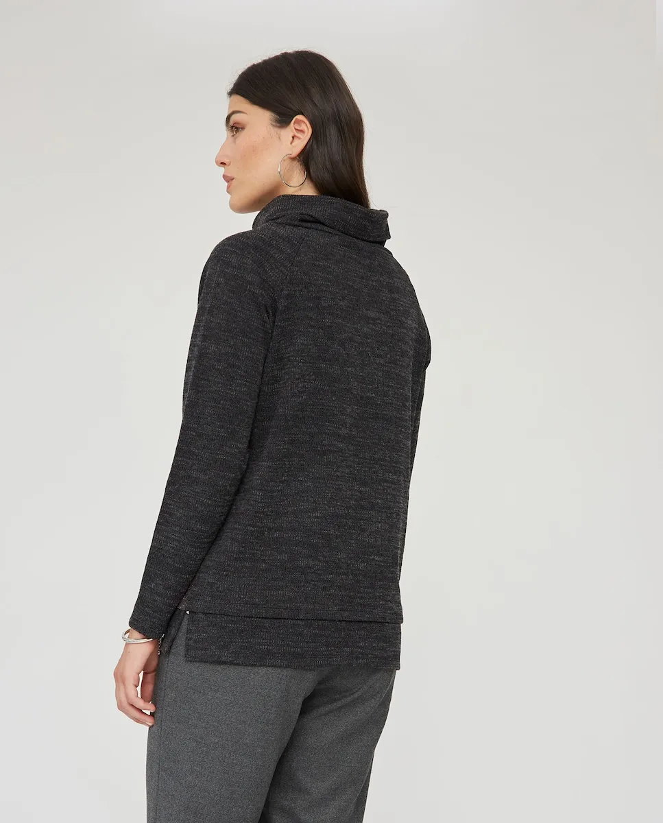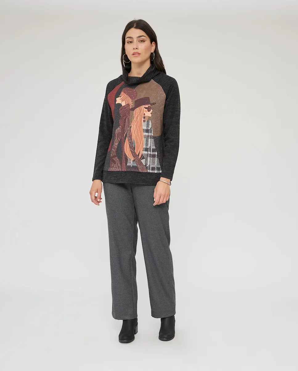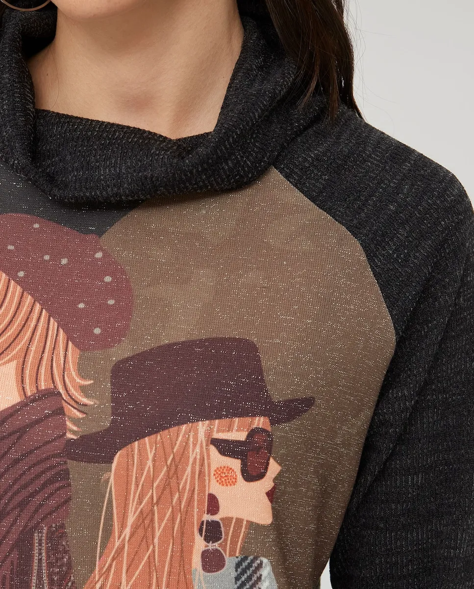 Свитер с высоким воротником и длинными рукавами реглан. Позиционный принт спереди. Деталь с подолом внизу и боковым разрезом.