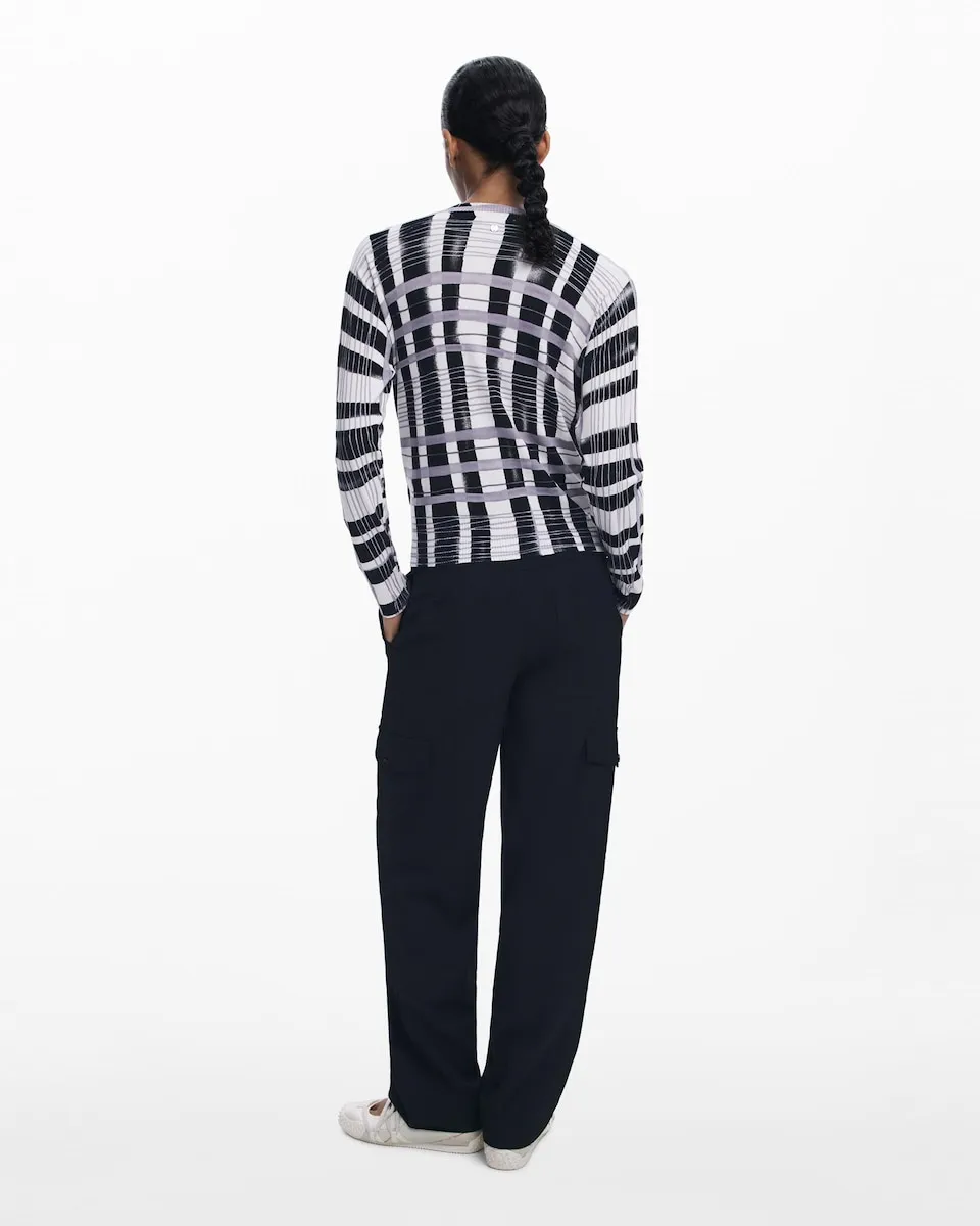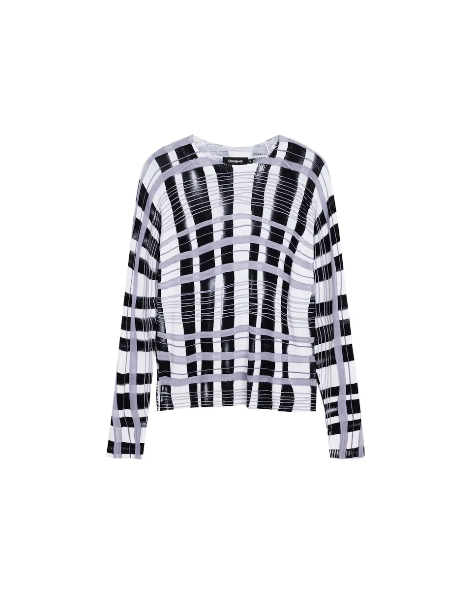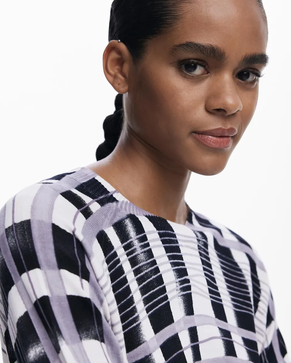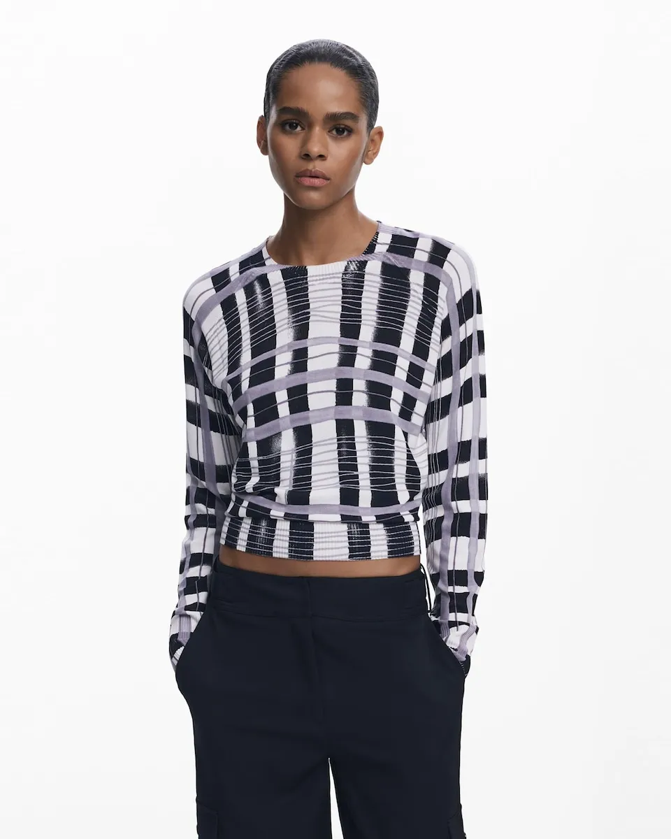 Тонкий джемпер с длинными рукавами и круглым вырезом с рисунком в горизонтальные и вертикальные полосы в стиле микедо. Полосатый принт. Крой: обычный. Рукав: длинный.