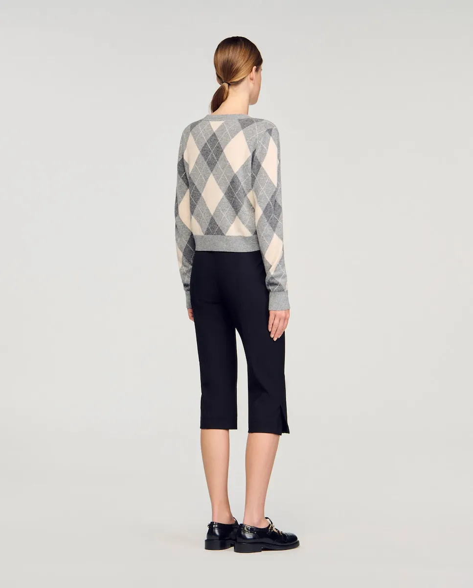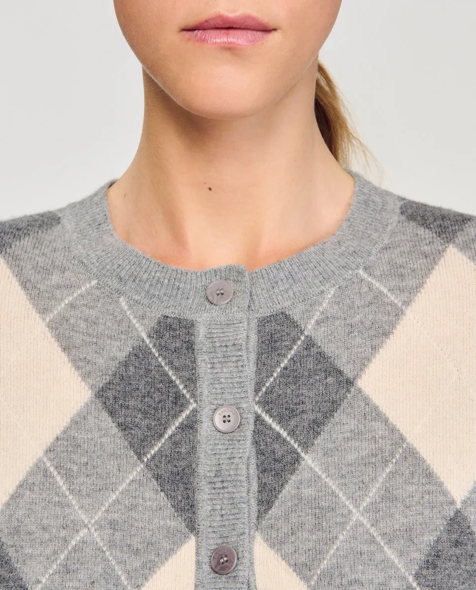 Кардиган с ромбовидным узором в шотландском стиле, с круглым вырезом, длинными рукавами, застежкой на пуговицы спереди и ребристой отделкой. Женский кардиган Sandro с ромбовидным узором. Круглый вырез. Длинные рукава. Застежка на пуговицы спереди. Ребристая отделка.